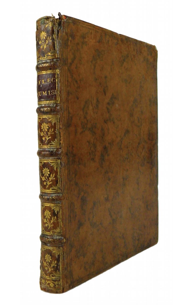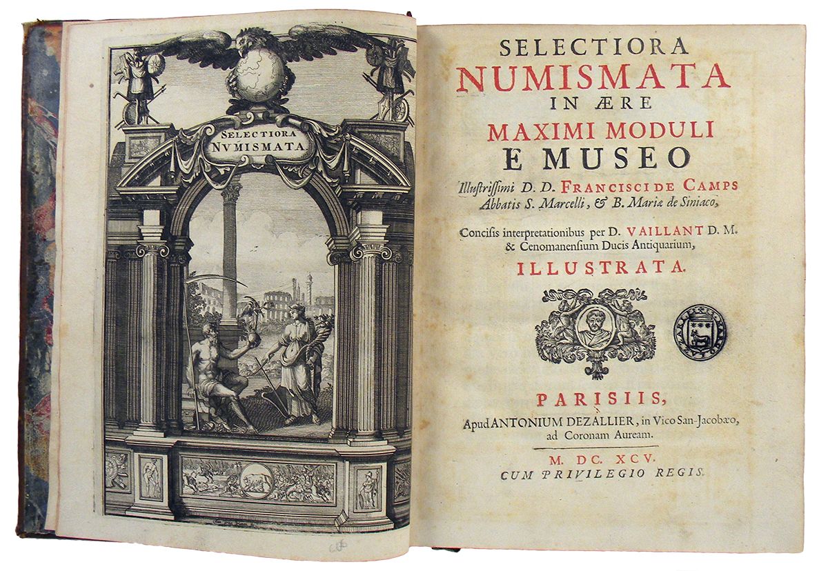 Vaillant, (Jo. Foy). SELECTIORA NUMISMATA IN AERE MAXIMI MODULI E MUSEO ILLUSTRISSIMI D.D. FRANCISCI DE CAMPS ABBATIS S. MARCELLI, & B. MARIAE DE SINIACO, CONCISIS INTERPRETATIONIBUS PER D. VAILLANT D.M. & CENOMANENSIUM DUCIS ANTIQUARIUM, ILLUSTRATA. Parisiis (Amsterdam): Apud Antonium Dezallier, 1695. Second edition. 4to [23 by 18.5 cm], contemporary full brown calf, paneled in blind; spine with five raised bands, decorated in gilt; red morocco spine label, gilt; marbled endpapers; all page edges red. (6), 132, (14) pages; finely engraved historiated frontispiece by Erlinger; title printed in red and black with a woodcut vignette; 59 engraved plates of ancient Roman coins. Occasional browning and marginal discoloration. Very good or better. A handsome production, cataloguing the larger pieces in the ancient coin collection formed by the Abbé François de Camps (1643-1723). Babelon 99. Dekesel F59. Hirsch 132. Lipsius 409.