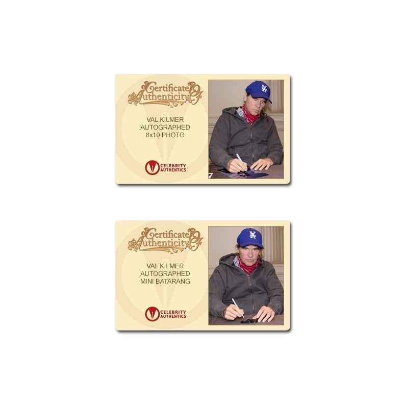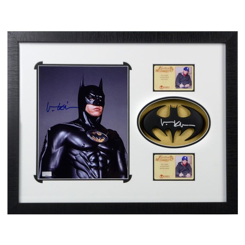 From the Framing Studios of Celebrity Authentics is this Batman Forever Mini Batarang and Batman 8"x10" Framed Display Set (approximately 18"x14" finished) personally hand-signed by Val Kilmer during his signing with Celebrity Authentics. Photo also comes complete with a Val Kilmer Autographed Batman Forever Mini Batarang. This film accurate Batarang measures approximately 4 1/2 inches across by 2 3/4 inches tall and is cast in hard resin. Ships affixed with the Celebrity Authentics serial-numbered and tamper evident Authentication Hologram and includes Celebrity Authentics Certificate of Authenticity featuring picture of Val signing each item to create the ultimate display piece. Please note, due to their packaging, to help ensure their safe delivery we are unable to combine framed photos with other items.