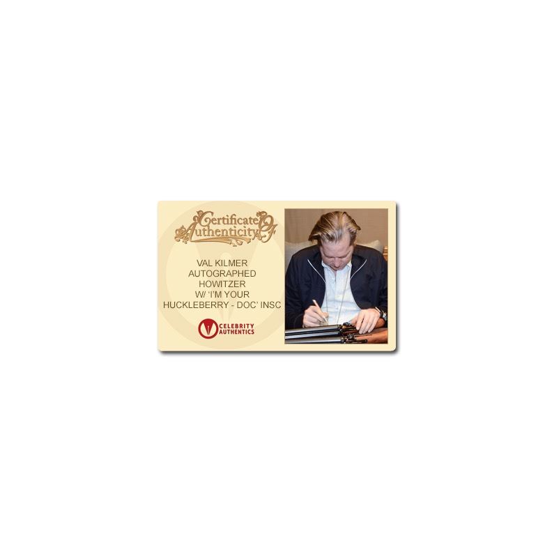 This Tombstone 1881 Street Howitzer non-firing Shotgun has been personally hand-signed by Doc Holliday himself, Val Kilmer during his autograph signing with Celebrity Authentics. Val received resounding acclaim for his portrayal of legendary Doc Holliday in the film Tombstone and this cut-down version of the famous Coach Gun also known as a "Street Howitzer" was carried by Doc Holliday to the gunfight at the OK Corral. Measures approximately 21.5 inches in length and features a break open barrel, functioning hammer and trigger action. Item ships affixed with the Celebrity Authentics serial-numbered and tamper evident Authentication Hologram and includes Celebrity Authentics Certificate of Authenticity featuring picture of Val signing Howitzer. Stock image used for product images. Item ships with clean, unsmudged autograph in similar location. Please note: In compliance with customs laws, this item cannot be shipped internationally.