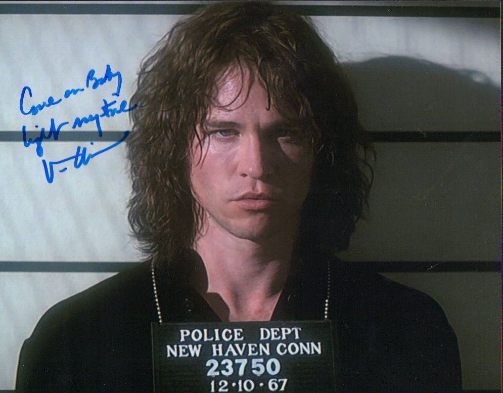 Color 8x10 photo signed by Val Kilmer in his role as Jim Morrison. He has added a lyric from the song Light My Fire. All items come with a certificate of authenticity good for the life of the piece.