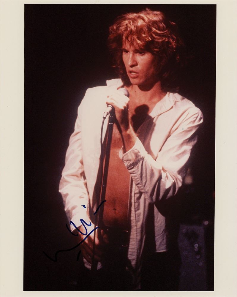 Color glossy 8 x 10 photo of Val Kilmer as Jim Morrison in Oliver Stone's 1991 biographical film The Doors, signed in blue felt tip. In fine condition.