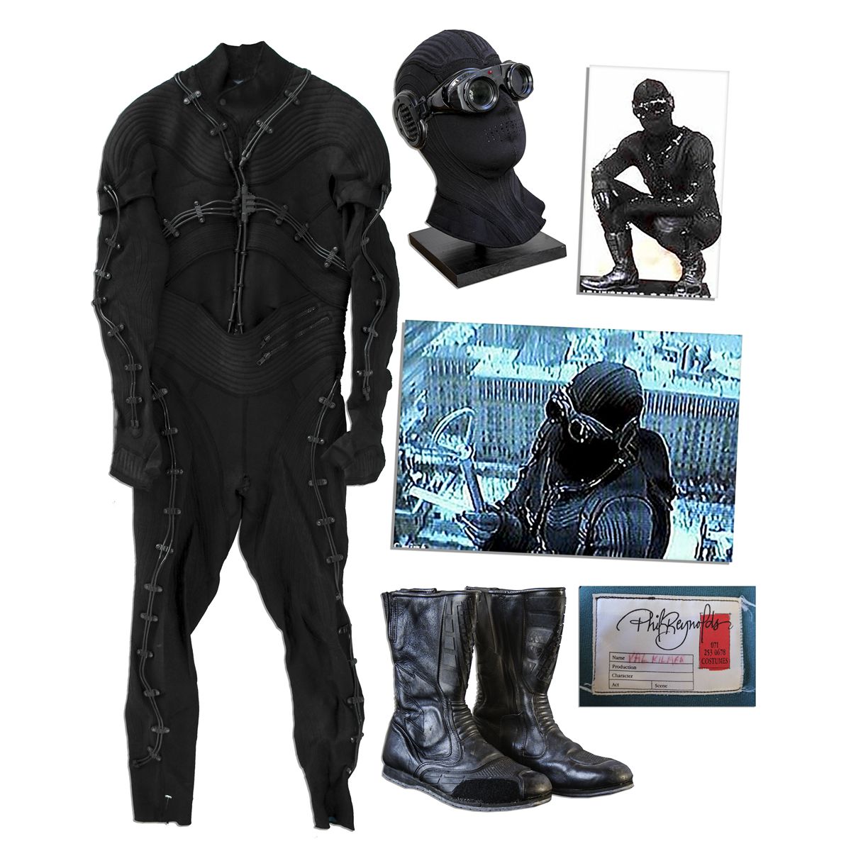 Val Kilmer's thermal suit from noir thriller ''The Saint''. Kilmer stars in the 1997 version of the oft-remade Hollywood favorite as Simon Templar, the anti-hero brainchild of 1930's writer Leslie Charteris. Costume consists of: (1) a one-piece black coverall suit in neoprene with wires running throughout, anchored by small cable clips. Measures 18'' across the chest, with 24'' sleeve and 29'' inseam. A Phil Reynolds tag within features a handwritten label, ''Val Kilmer'', (2) matching cowl with built-in goggles, (3) pair of black boots in leather with rubber trim by Fieldsheer in size 11. Repaired split to crotch of suit, else lot is near fine. From Movies Galore.