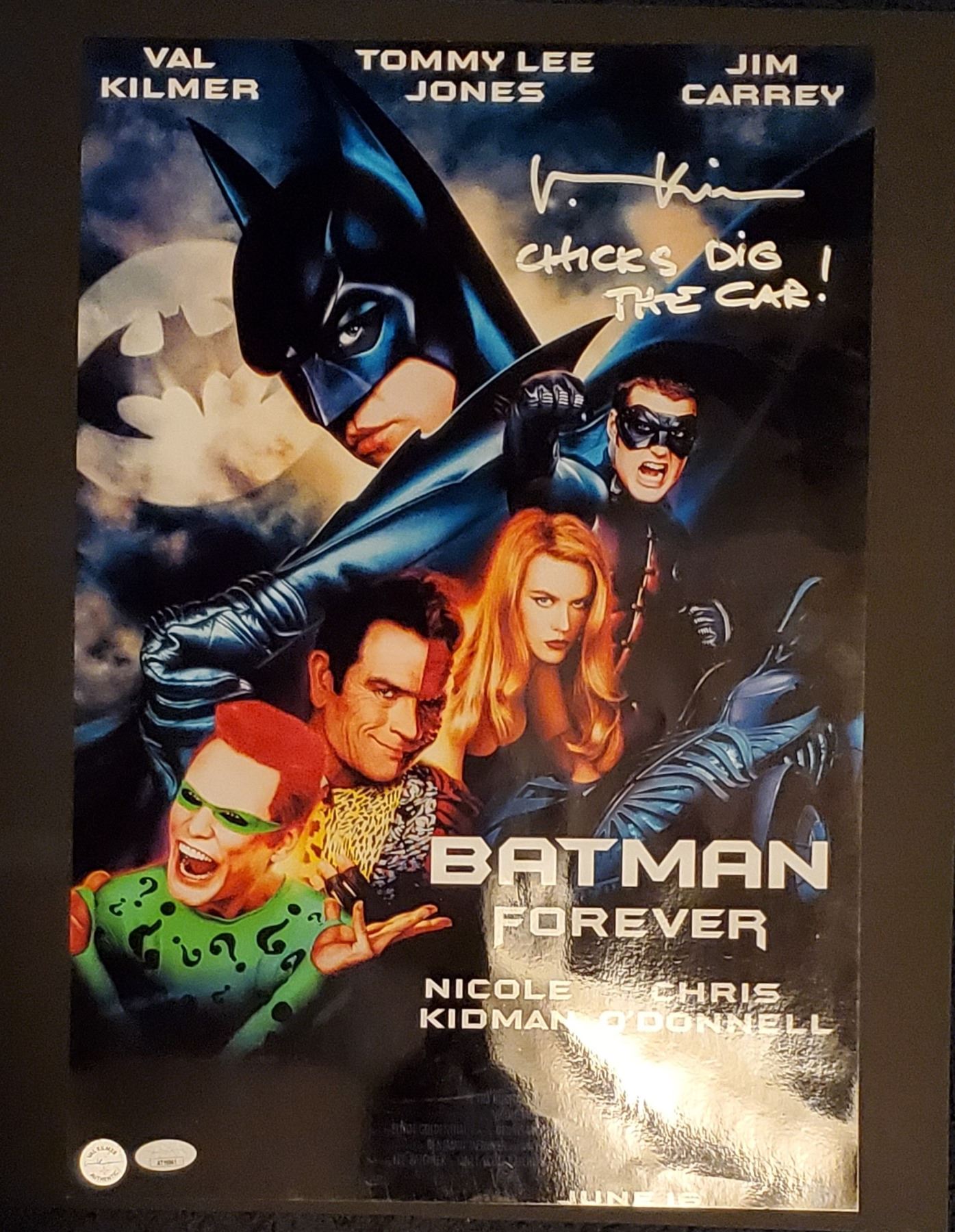 A 16” x 20” photograph signed by Val Kilmer. The autograph s authenticated by JSA who issued a COA numbered AT15961. The photo advertises Batman Forever (1995).