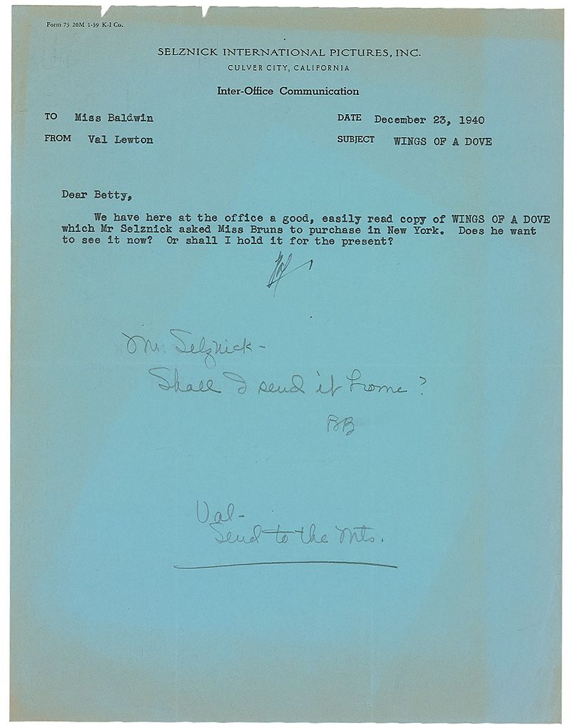 Film producer and screenwriter (1904-1951) known for producing low-budget horror movies throughout the 1940s, including The Cat People. TLS signed “Val,” one page, Selznick International Pictures letterhead, 8.5 x 11, December 23, 1940. A brief inter-office inquiry. In full: “We have here at the office a good, easily read copy of Wings of a Dove, which Mr Selznick asked Miss Burns to purchase in New York. Does he want to see it now? Or shall I hold it for the present?” Pencil notations for inter-office communication have been added below in a different hand. In very good condition, with moderate toning to the top and bottom, intersecting folds, a crease to the upper left corner, and light edge chips along the top edge.