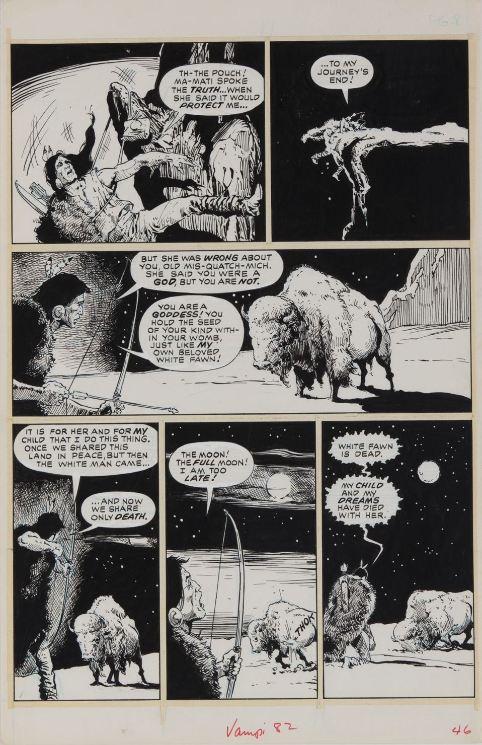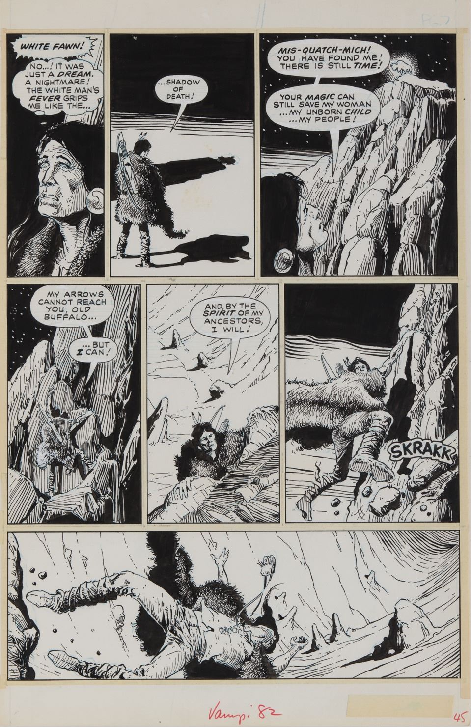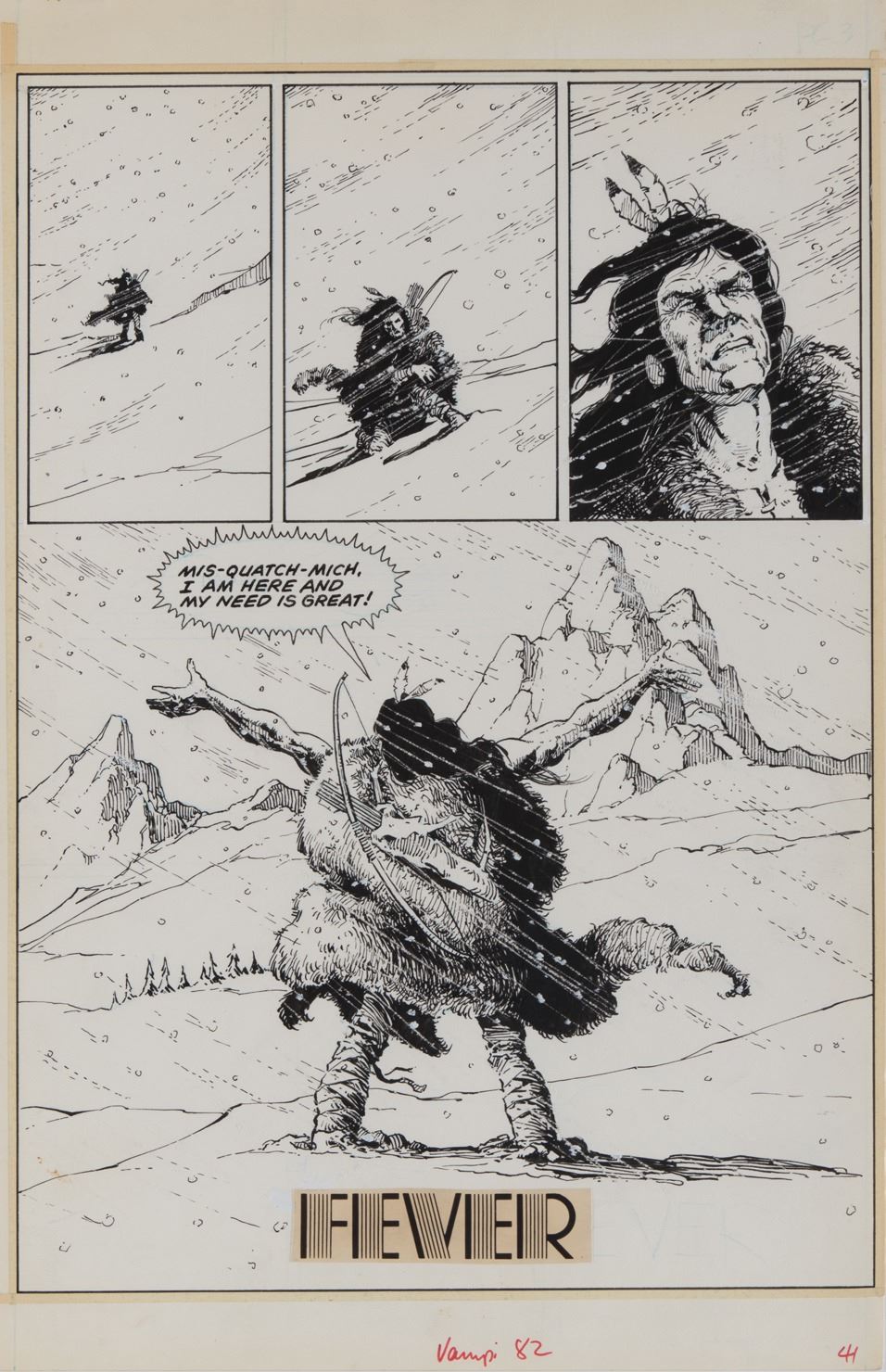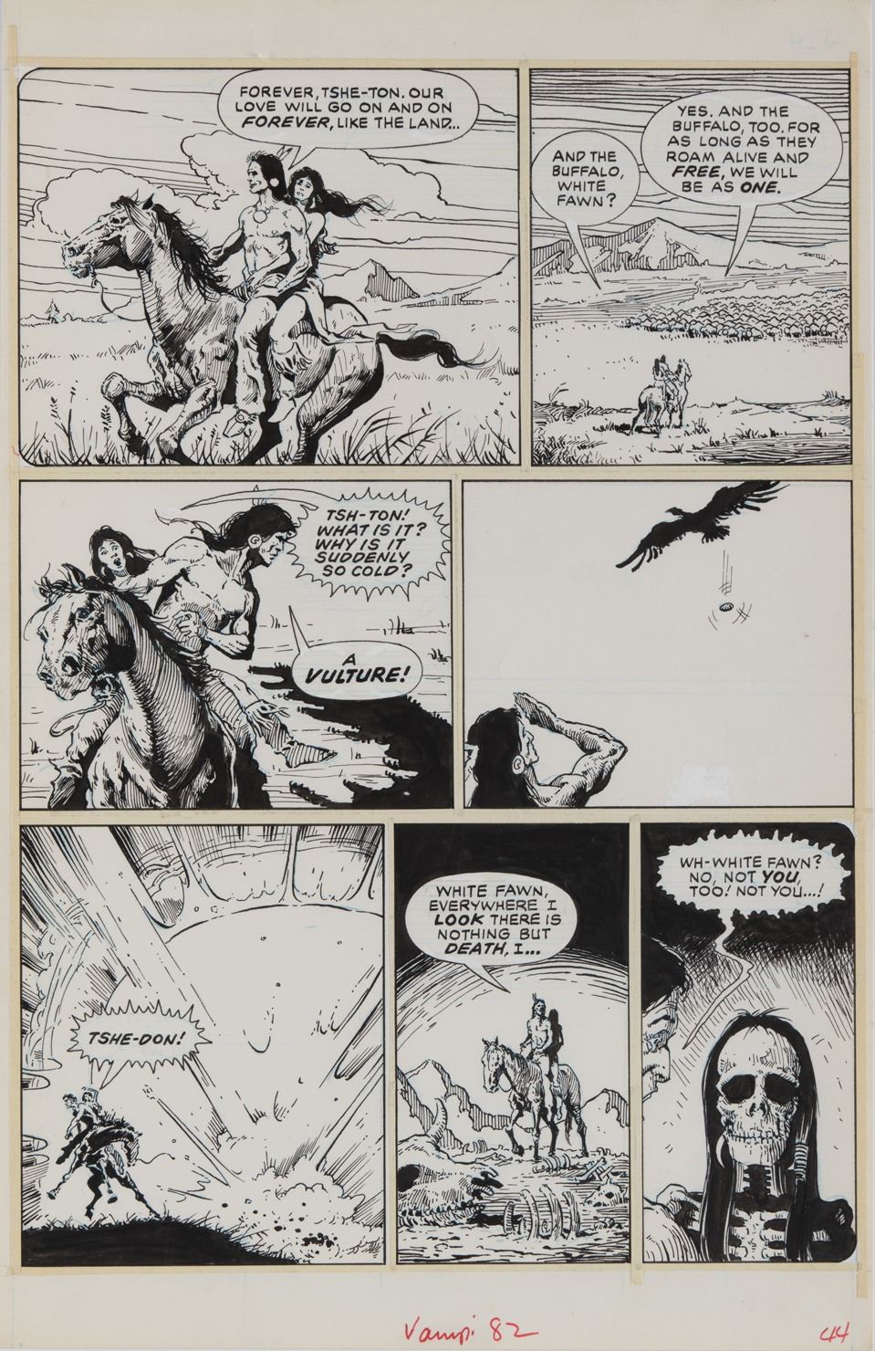 162. Val Mayerick (9) pages of original artwork from the story "Fever" for Vampirella #82. (Warren, 1979) Accomplished in pencil and ink on 11 x 17 in. art board. Each panel is delicately bordered with tape as used by Warren for printing. Consisting of (9) pages from a very finely drawn tale of a Native American family's struggle against a supernatural enemy. Mayerik's delicate inks are sublime. In very good condition. $500 - $700
