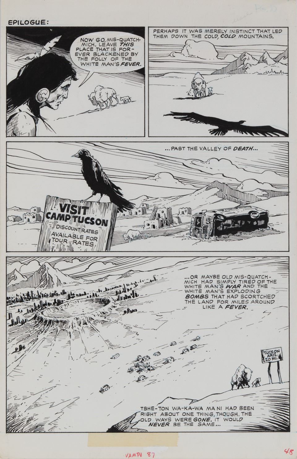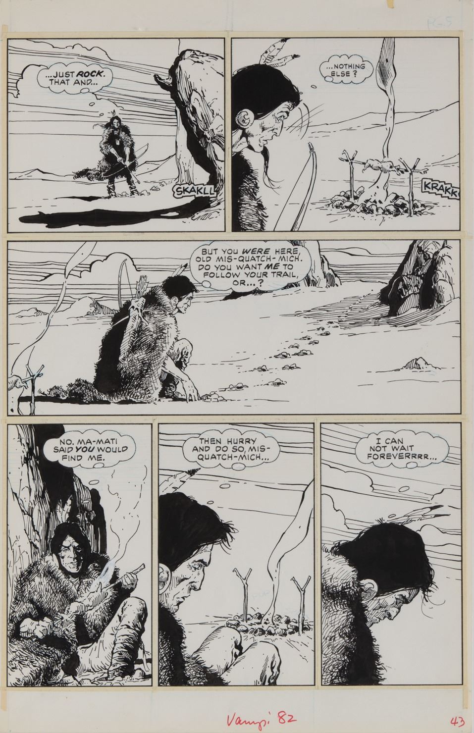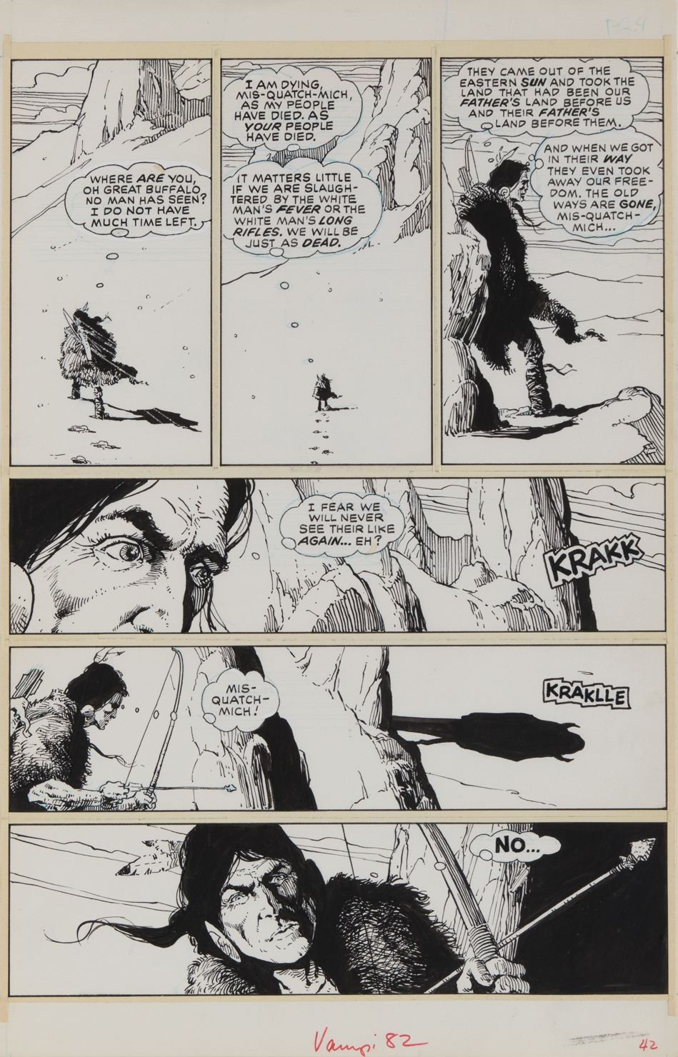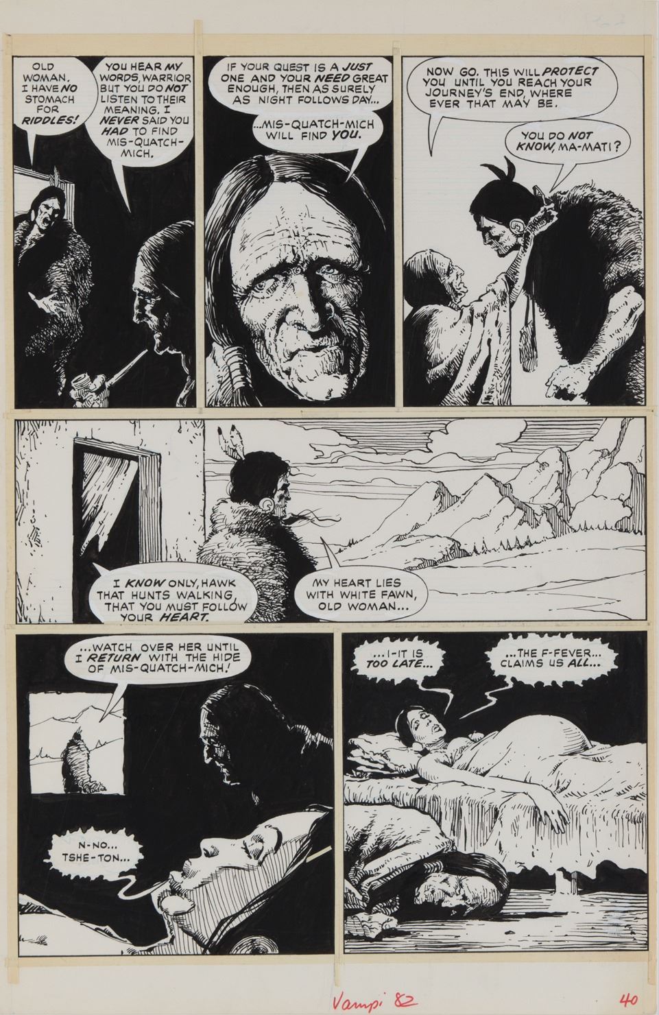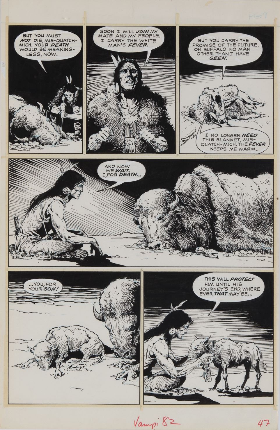 162. Val Mayerick (9) pages of original artwork from the story "Fever" for Vampirella #82. (Warren, 1979) Accomplished in pencil and ink on 11 x 17 in. art board. Each panel is delicately bordered with tape as used by Warren for printing. Consisting of (9) pages from a very finely drawn tale of a Native American family's struggle against a supernatural enemy. Mayerik's delicate inks are sublime. In very good condition. $500 - $700