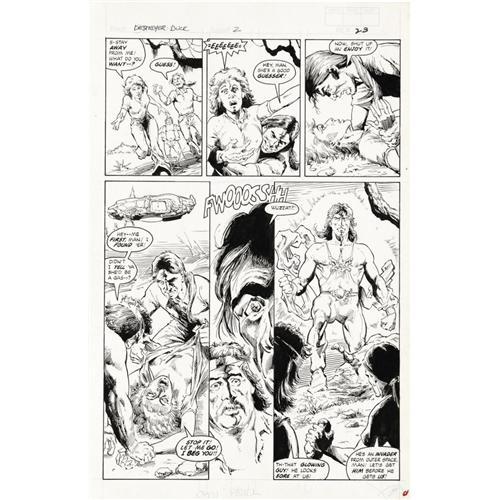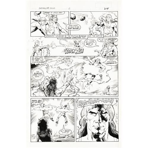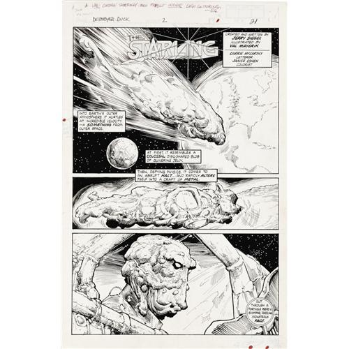 <B>Val Mayerik - Destroyer Duck, Six Complete 8-page Chapter Stories "The Starling" Original Art, Group of 48 pages (Eclipse, 1983-84).</B></I> Writer Jerry Siegel, together with artist, Val Mayerik, chronicled the worlds beyond imaging of the half alien, half human, Robert Zane, in these six chapters of "The Starling," which were published in <B>Destroyer Duck</B></I> #2 - 7. All 48 pages are included here! Each chapter consists of eight pages, and one of the pages has been hand-colored by Mayerik in marker. Each page has an image area of 10' x 15" and they average in Very Good condition. This is the last published work of Siegel, co-creator one of the best-known fictional characters of all time, Superman! <BR><BR><B>Important notice:</B> Heritage usually auctions material at the rate of 200-250 lots per hour. On some occasions eBay Live bid software or the Internet may not be able to keep up with the pace of the auction. We recommend placing a realistic absentee bid now as insurance to avoid disappointment. Occasionally the auctioneer may eliminate or reject an eBay Live bid, and the auctioneer may also reopen a lot after the close of the eBay live bidding (usually because we missed an audience bid), and may reject your bid even if it shows you as the winning bidder. By bidding via eBay Live, you agree that Heritage may award the lot to another bidder at its sole discretion under the circumstances described above or any other reasonable circumstances. Since eBay bids are not shown to us until we open the lot on the floor, we treat those bids just like floor bids. In most cases the floor responds before the eBay bid is presented to us, due to Internet lag time, so for consistency we have made it a policy that floor bids are always considered first over tie eBay live bids. Also please note that all Heritage lots purchased through eBay Live carry a 22.5% Buyer's Premium. Please make sure you read the Terms and Conditions before you bid. This lot is being auctioned in conjunction with a live floor auction by Heritage Auction Galleries. All final auction and invoice information will be supplied by Heritage Auction Galleries, and all other information should be considered preliminary. Lot:41001 <BR><BR><B>Winning Notification and Billing:</B> After the FINAL session in this auction is complete, Heritage will send e-mail and snail mail invoices. This process normally takes several days. All final auction and invoice information will be supplied by Heritage Auction Galleries, and all other information should be considered preliminary. <BR><BR>This auction will be conducted on a live auction floor and over the Internet through eBay Live. If you choose to place an absentee bid, please take a moment to <font color='#0000ff'><u><a href='http://pages.ebay.com/liveauctions/help/before/laabsentee.html'>learn how eBay Live absentee bidding works</a></u></font><font color='#000000'>