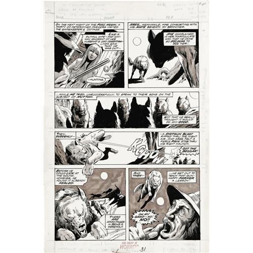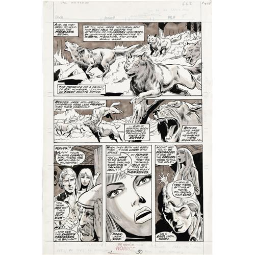 <B>Val Mayerik and Mike Esposito - The Haunt of Horror #1 Page Original Art, Group of 3 (Marvel, 1974).</B></I> Ares is many things to many people... husband, son-in-law, pack-mate. His wife suspects that he is cheating, but Ares has a little problem when the full moon rises, because he's a bona fide <I>werewolf</B></I>! This hairy situation is brought to you by penciler Val Mayerik and inker Mike Esposito, in "His Own Kind," written by Roy Thomas. The image area of each page measures 10" x 15" and each is in Excellent condition.<BR><BR><b>Shipping:</b> Small Flat (<a target="_blank" href="http://www.heritageauctions.com/common/shipping.php">view shipping information</a>)