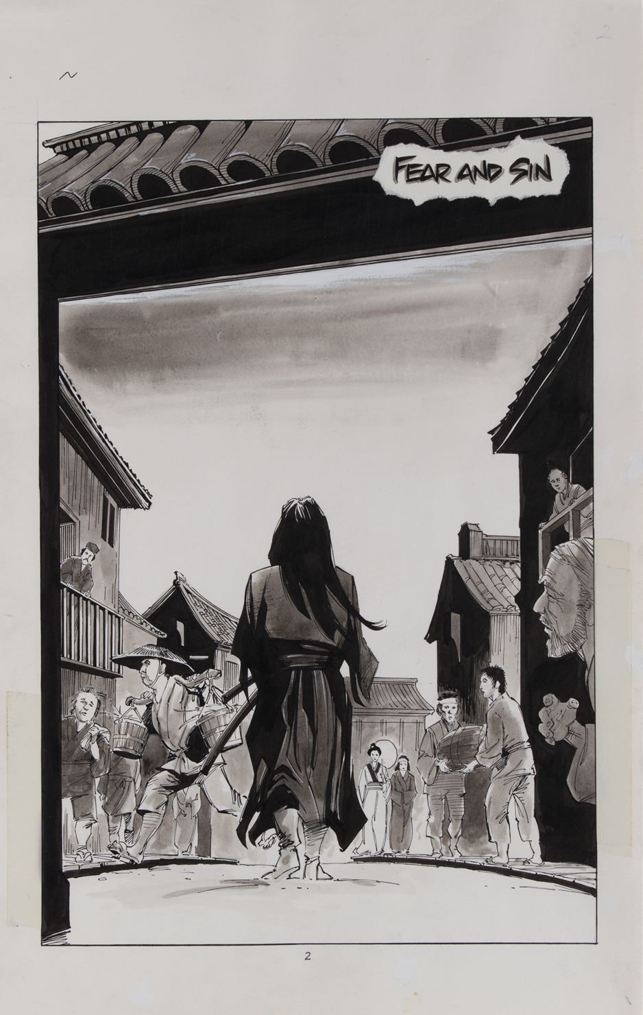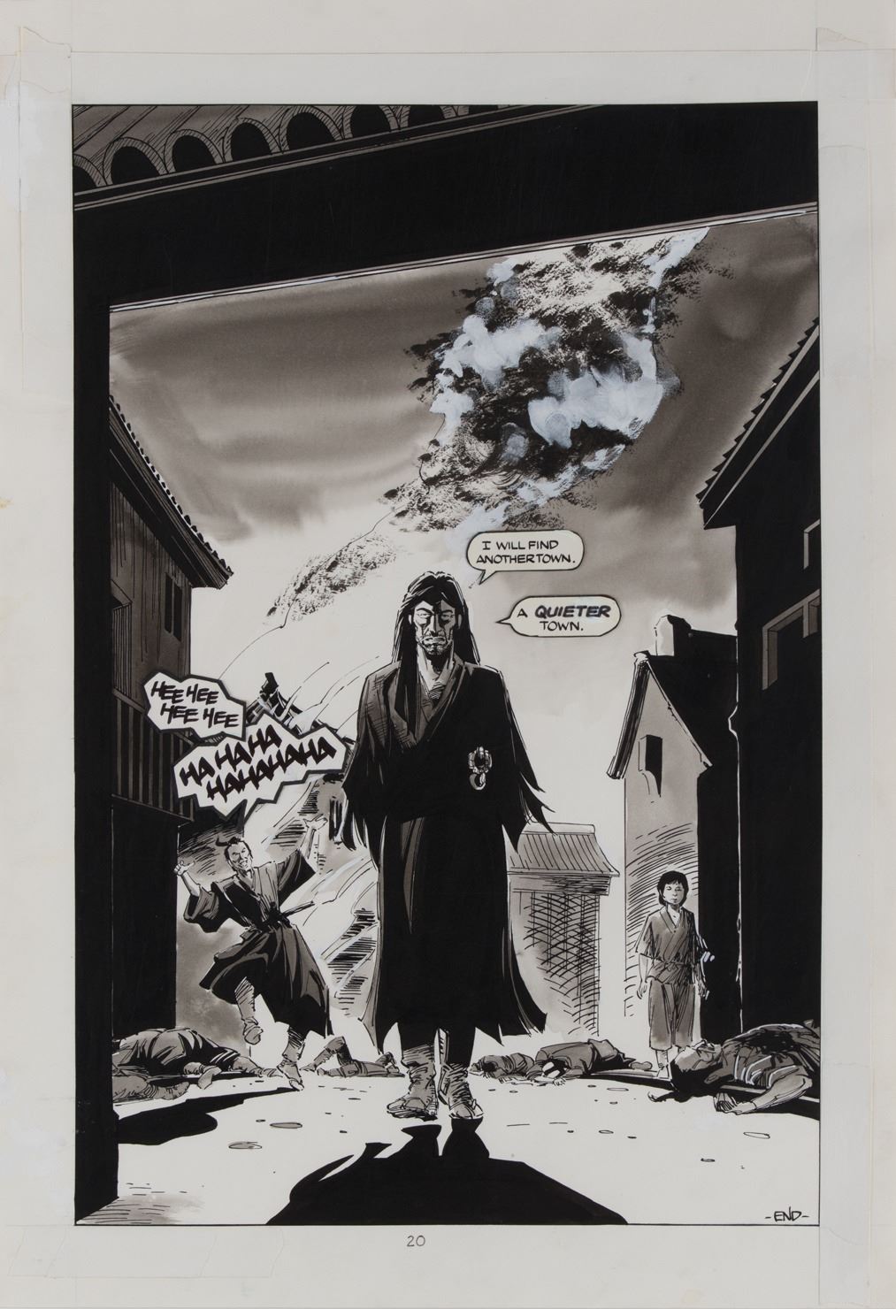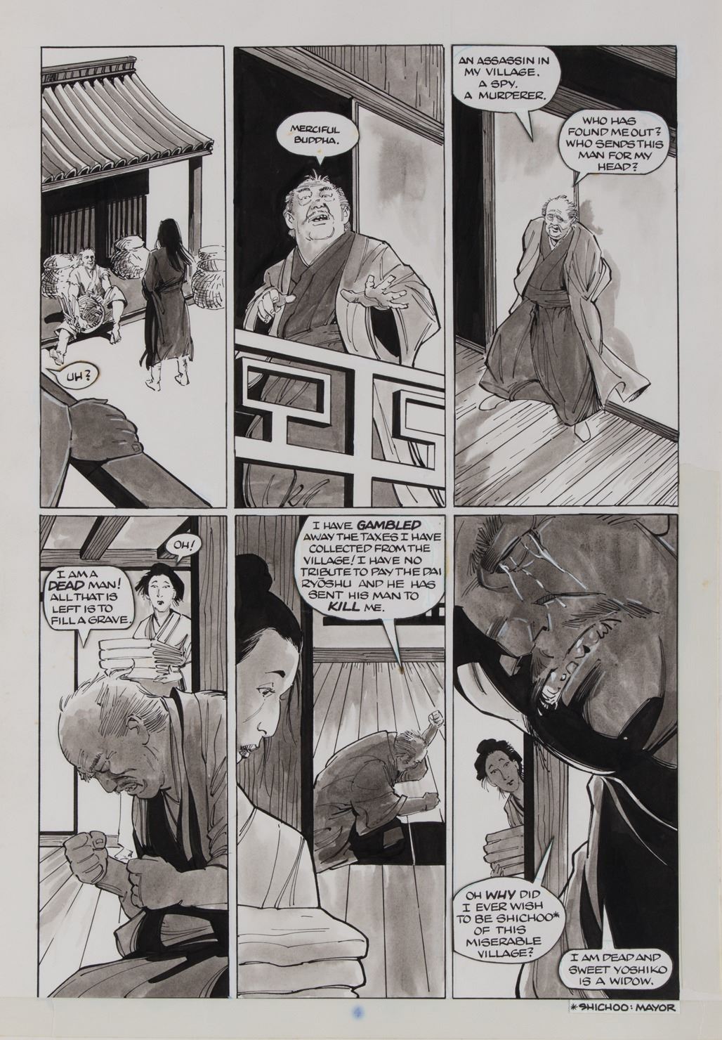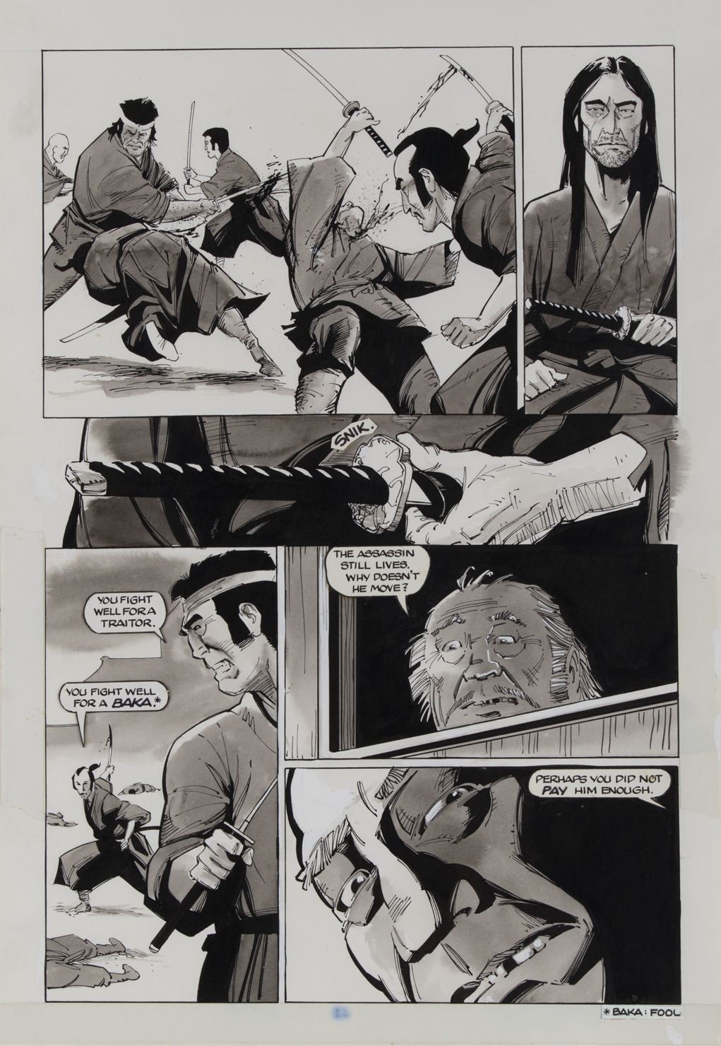 167. Val Mayerik original artwork for Young Master #9 complete 22-page story "Fear and Sin". (New Comics Group, 1987) Accomplished in pencil, ink, and ink wash on 14.4 x 22 in. art board. Great Samurai and western vibe, with many large and arresting panels of finely executed art. In very good condition. $200 - $300