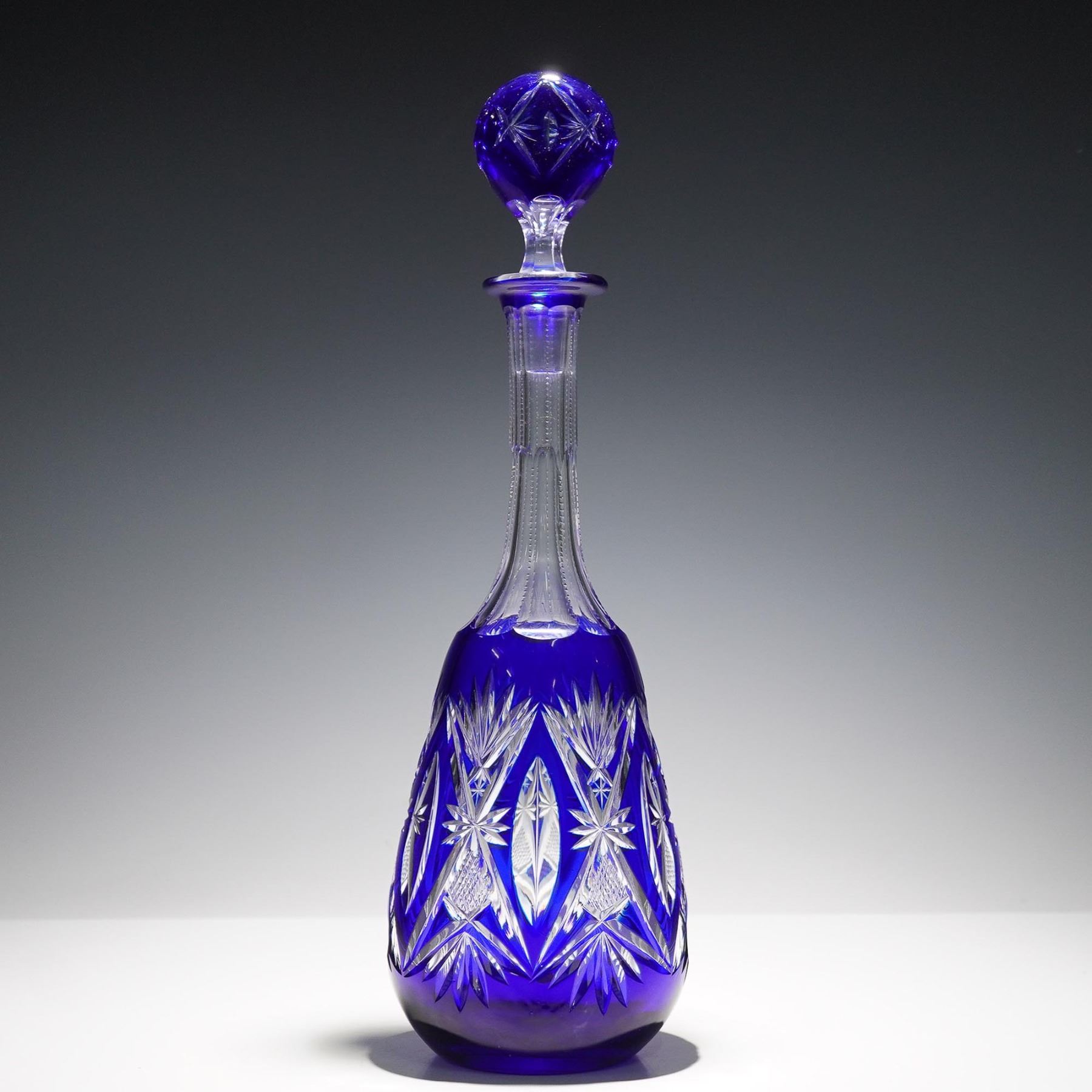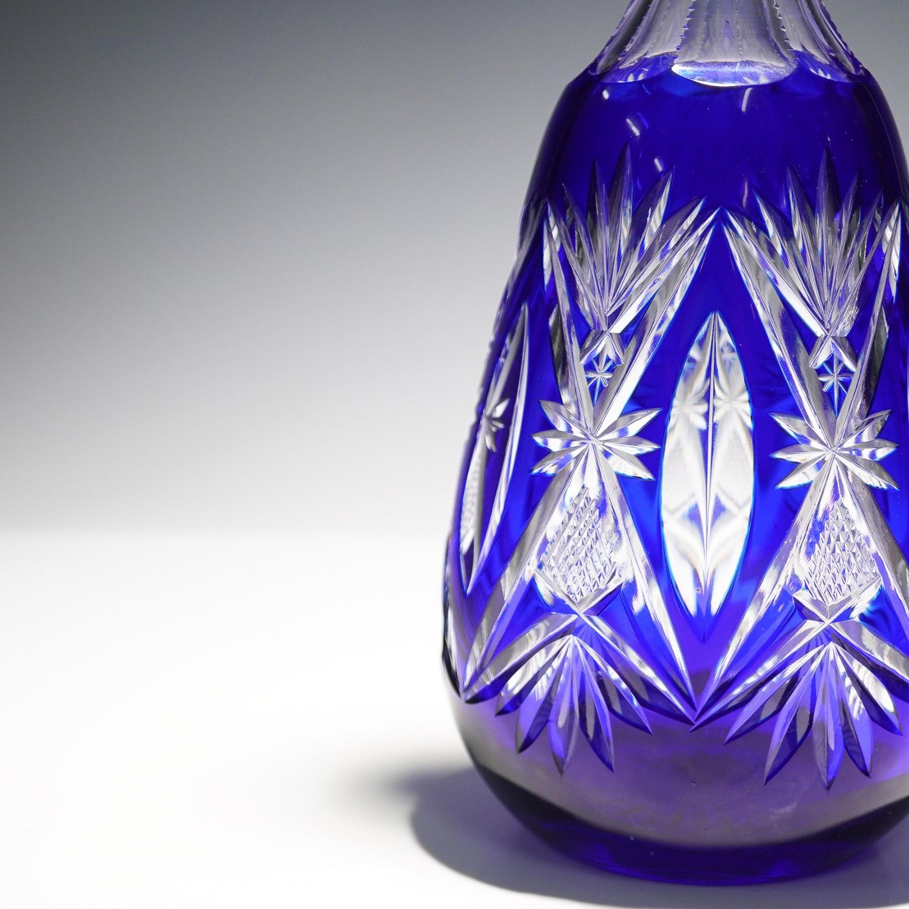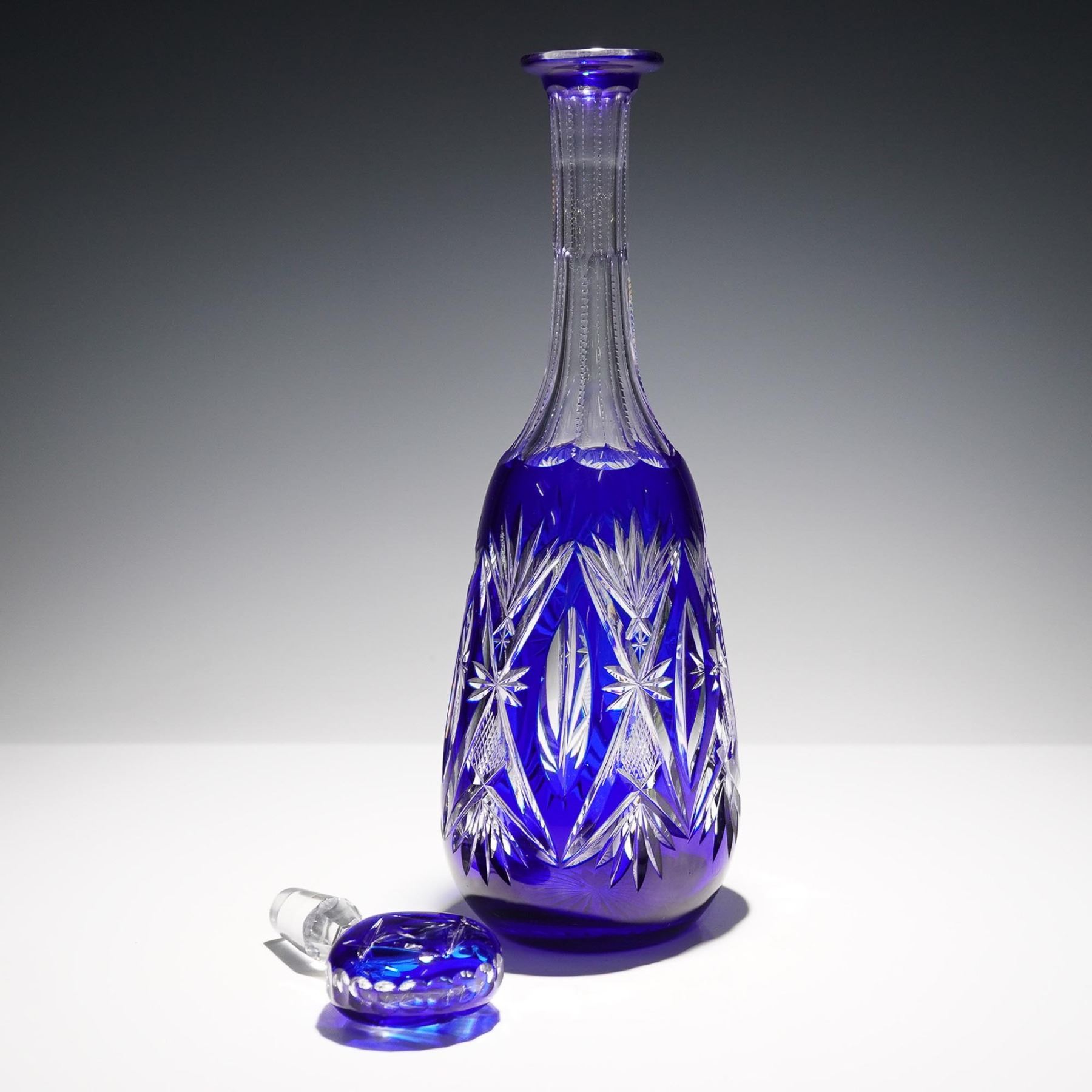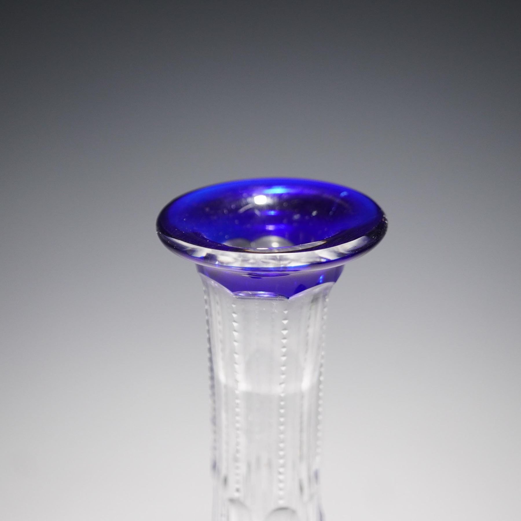 Val Saint Lambert's intricately cut clear crystal showcases a stunning cobalt blue hue, creating a striking contrast that enhances its exquisite design.