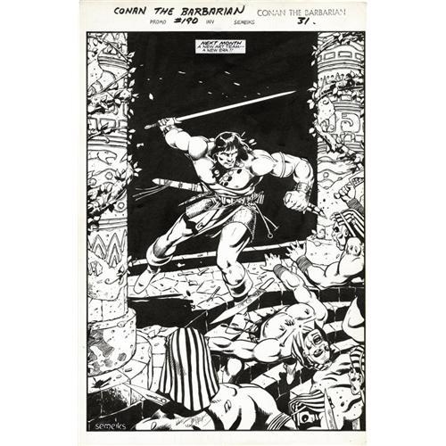 <B>Val Semeiks - Conan the Barbarian #190, Splash page 31 Original Art (Marvel, 1987).</B></I> Val Semeiks began his professional career in 1986, drawing back-up "King Kull" stories for <B>The Savage Sword of Conan</B></I>. This one-page promotional page announces his move into the position as regular penciler for <B>Conan the Barbarian</B></I>. This deadly and detailed pen and ink has an image area of 10" x 15". In Excellent condition. Signed by Val Semeiks at the lower right. <BR><BR><b>Shipping:</b> Small Flat (<a target="_blank" href="http://www.heritageauctions.com/common/shipping.php">view shipping information</a>)