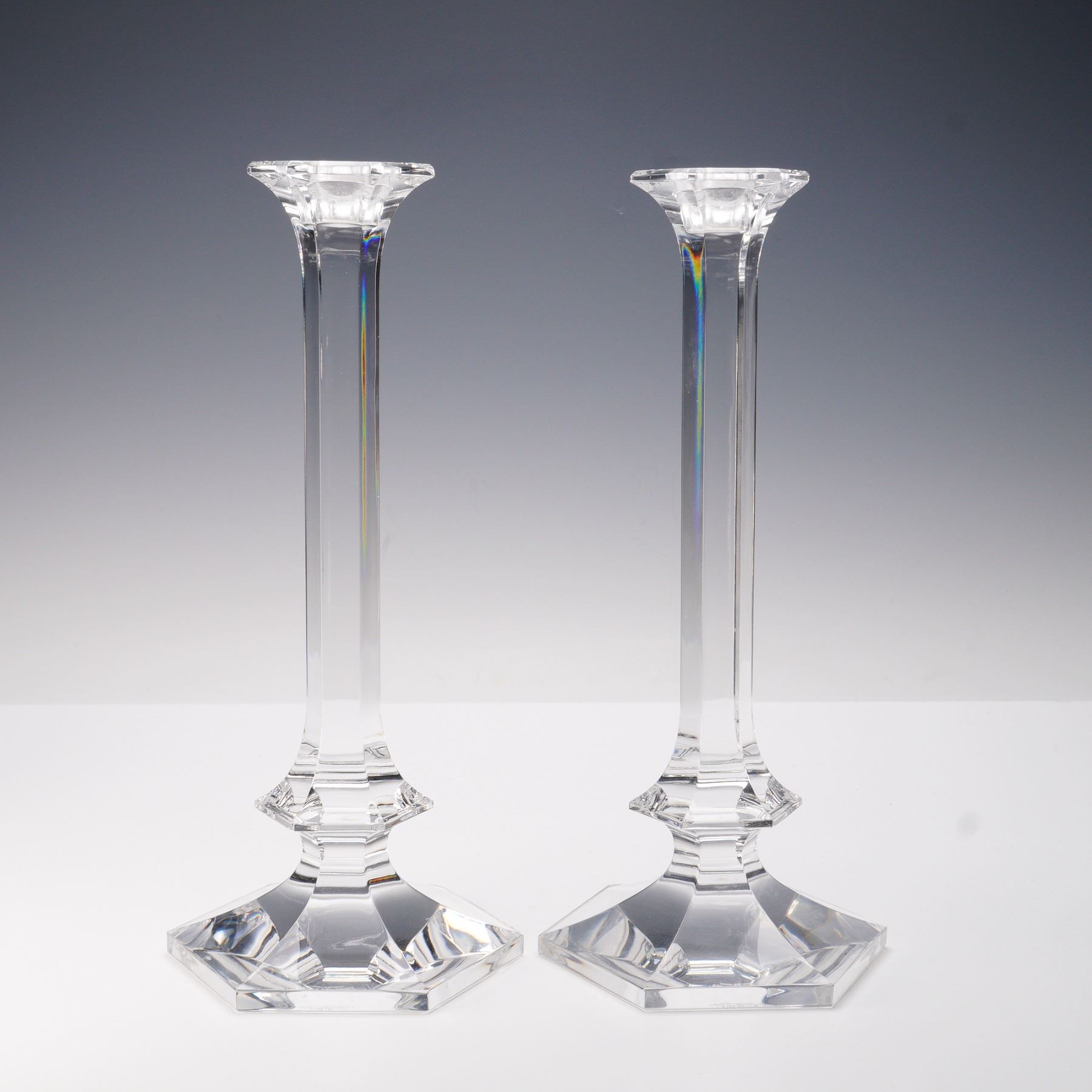 Elegant pair of hand-cut crystal candle holders by Val St. Lambert of Belgium, featuring a refined octagonal base and elongated faceted stems that capture and refract light beautifully. Each piece showcases the brand's hallmark etched signature on the base, representing the renowned craftsmanship of one of Europe's premier crystal houses. A timeless addition to any dining or display setting.
