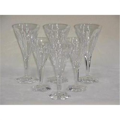 Six Val St Lambert glasses, 3 are 7 3/4'' tall water goblets, hand signed, one with a chip on the rim. 3 are 6 1/2'' tall wine glasses,unsigned, two with chips on rims. All sold 'as is'