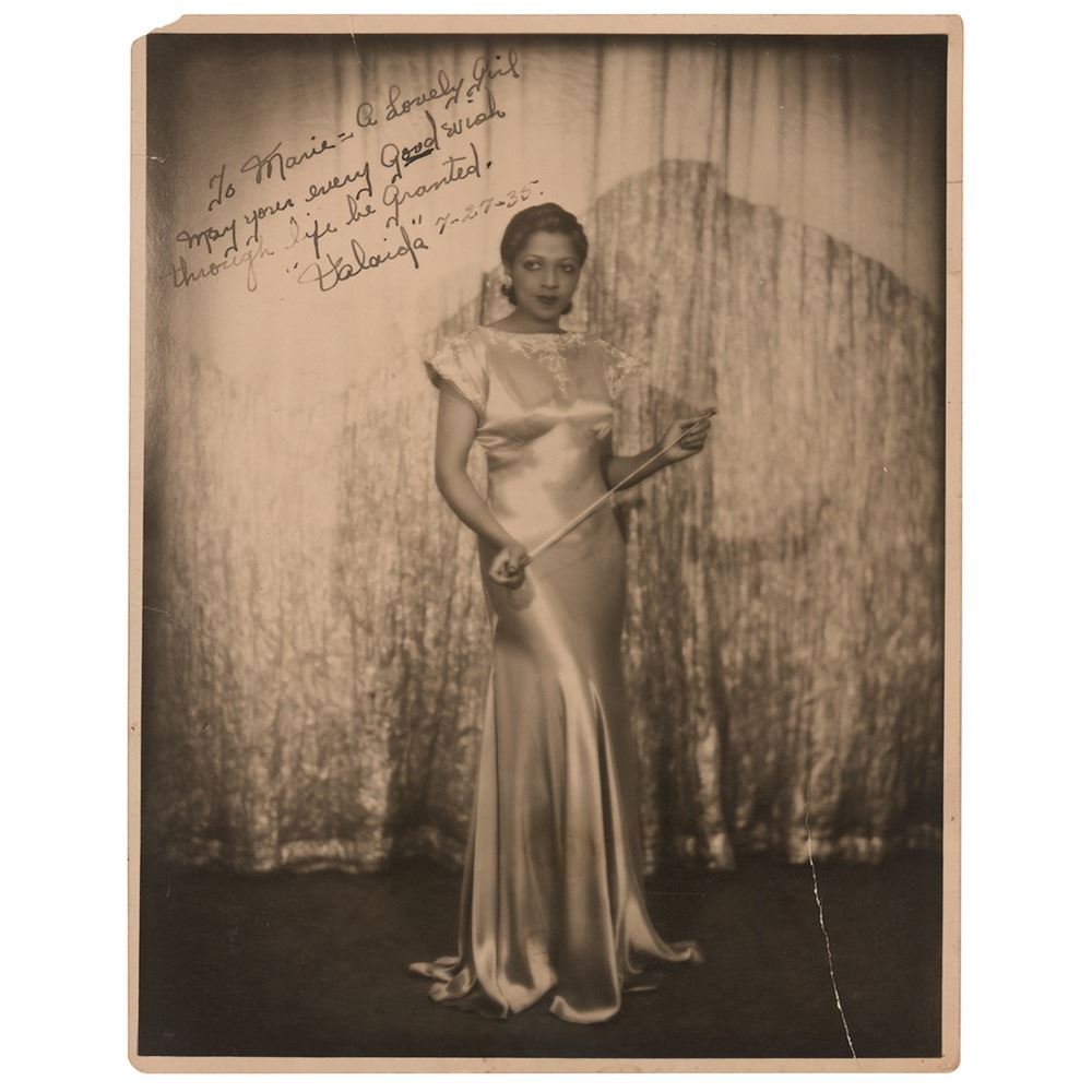 Vintage matte-finish 7.75 x 10 photo of Snow in a full-length pose, signed and inscribed in fountain pen, "To Marie—A lovely girl, may your every good wish through life be granted. 'Valaida,' 7-27-35.†In very good condition, with a missing upper left corner tip, and a tear to the lower right.