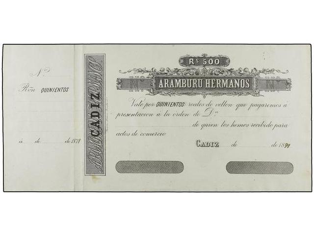 Vale 500 Reales de Vellón. 18__. ARAMBURU HERMANOS. CÁDIZ. Matriz izquierda. EBC-.