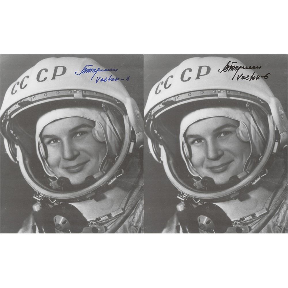 Two identical 8 x 10 cardstock photos of the first woman in space, both signed in felt tip by Tereshkova with the addition of her mission name, "Vostok-6." In fine condition.