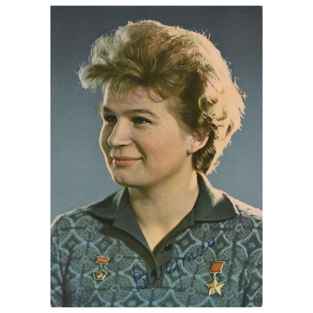 Color 4 x 6 Soviet postcard photo of Tereshkova wearing her medals, signed in blue ink. In fine condition, with some surface loss on the back.