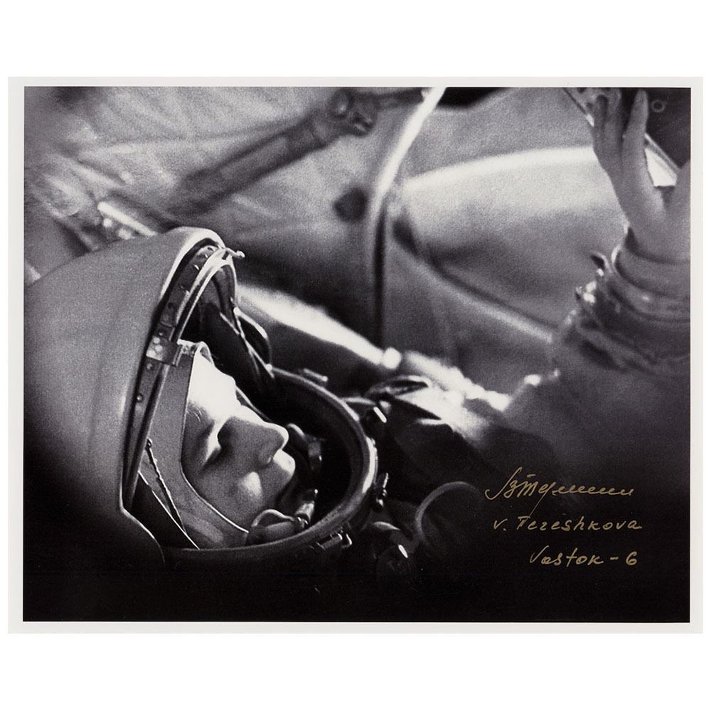 Appealing satin-finish 10 x 8 photo of Valentina Tereshkova in her Vostok 6 capsule, signed in gold ink in Cyrillic and English and adding "Vostok 6." In very fine condition.