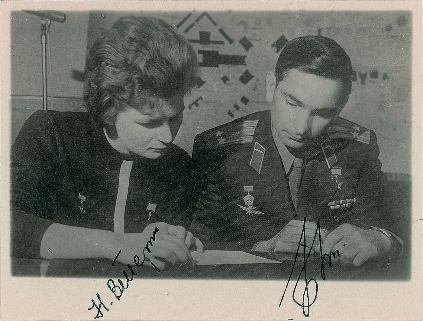 Textured matte-finish 6 x 4.5 photo of cosmonauts Valentina Tereshkova and Valery Bykovsky, signed in fountain pen by both. In fine condition.