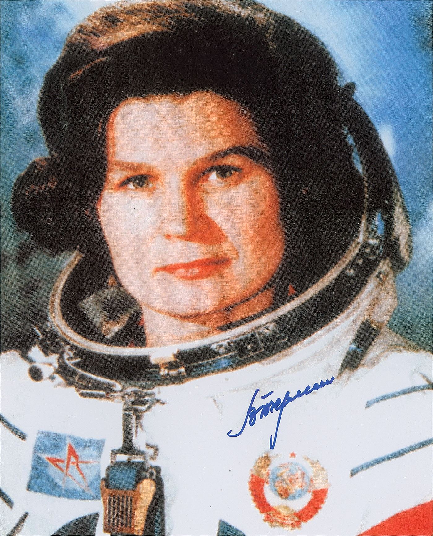 Color semi-glossy 8 x 10 double-weight photo of Terehkova in her space suit, signed in blue felt tip. In fine condition.