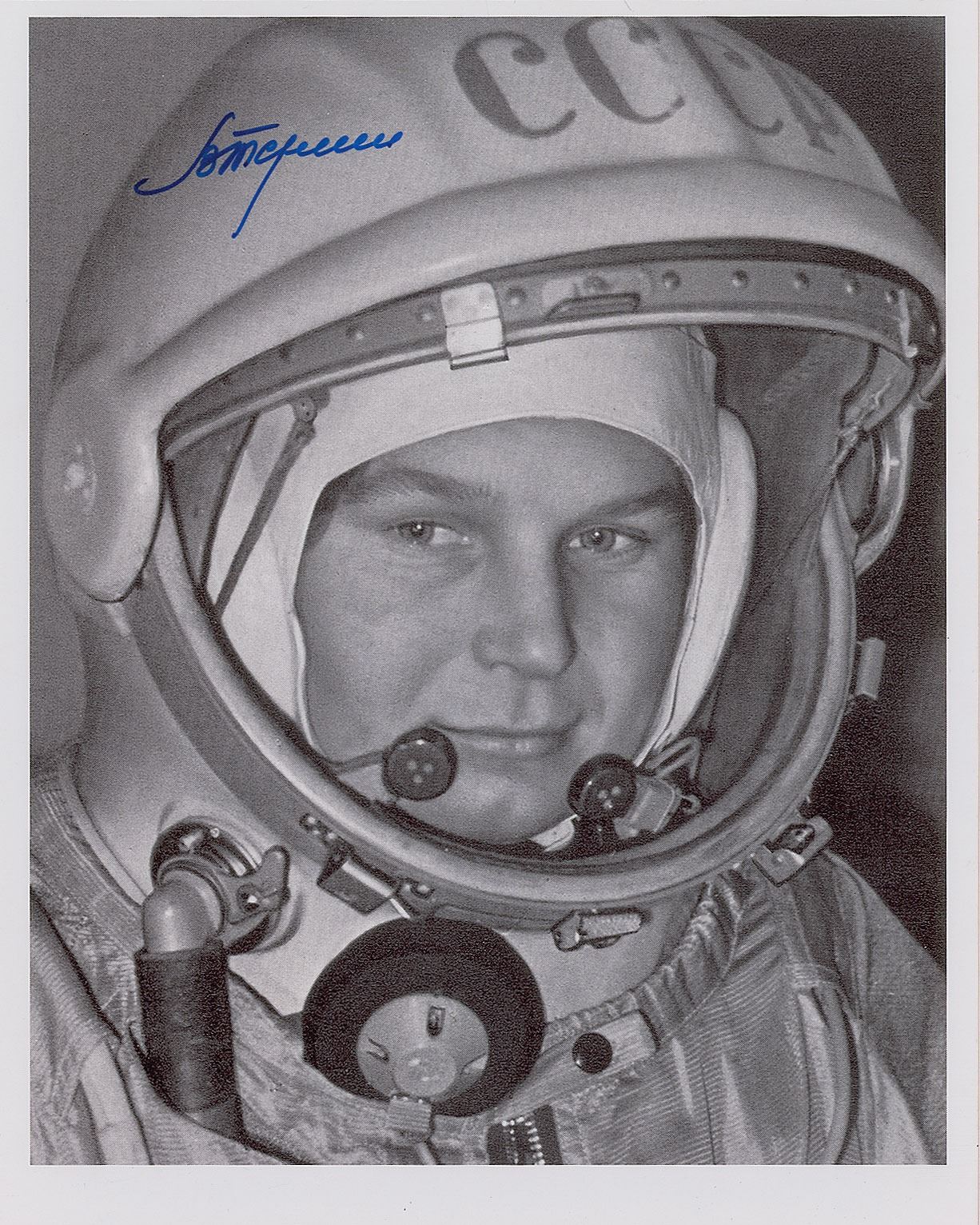 Satin-finish 8 x 10 photo of Valentina Tereshkova smiling in her cosmonaut space suit, signed in Cyrillic in blue felt tip. In very fine condition.