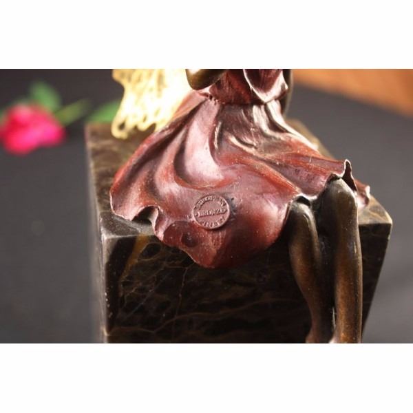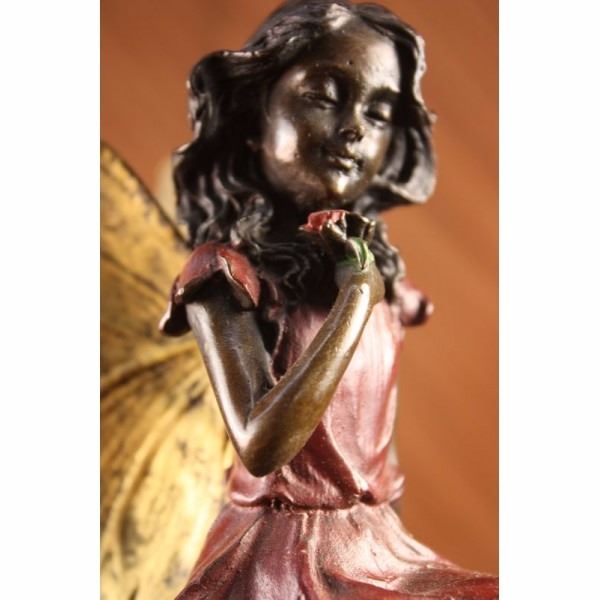 Daydreamers will fall in love with this daydreaming fairy.She sits on a rock and gazes out into the mystical land around her. She dangles her legs over the side and crosses her ankles. She is lulled by the soft sounds of life and fantasy around her. Her fairy wings arch behind her.Her long red patina dress cascades down around her and she sniffs a sweet flower. This would be a sweet addition to any young girl's room. 100% bronze and handmade, this sculpture was cast using the Lost Wax Method and mounted on a marble base and is signed by artist Milo. Condition: This sculpture is in very good condition. Bronze Dimensions with Marble Base:Height 9" x Width 8" Marble Dimensions: 3" X 3" Height without base: 6 1/2" Weight : 8 LBS Inventory; 73-B7152237
