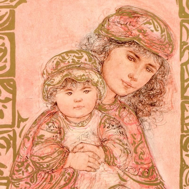 "Valentine and Kore" is a limited edition lithograph on rice paper by Edna Hibel (1917-2014), numbered and hand signed by the artist. Includes Certificate of Authenticity. Measures approx. 18" x 22" (border), 15.5" x 20" (image).