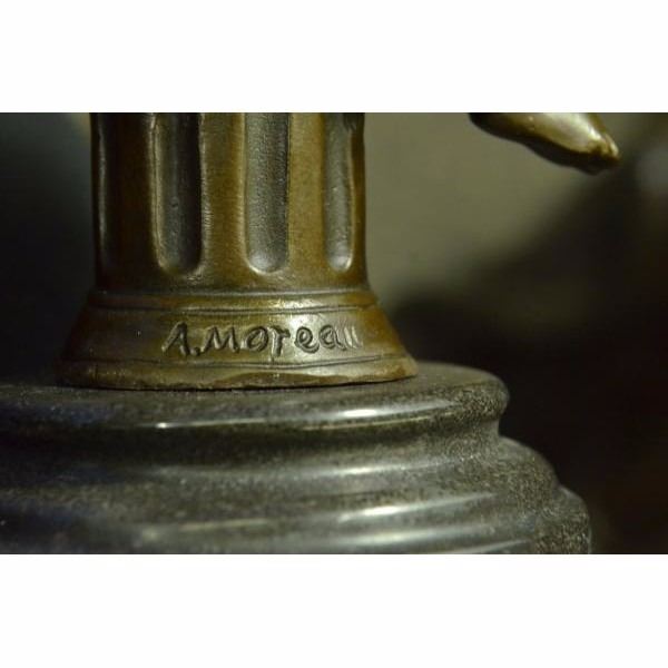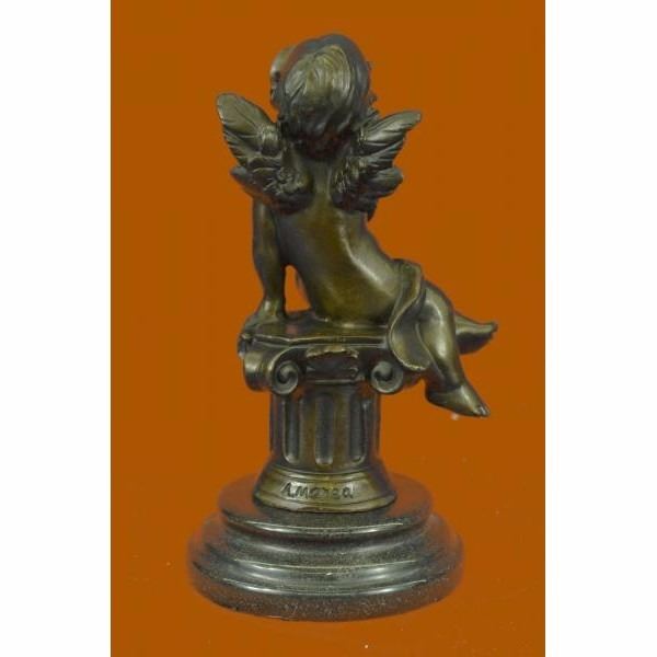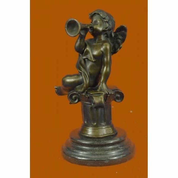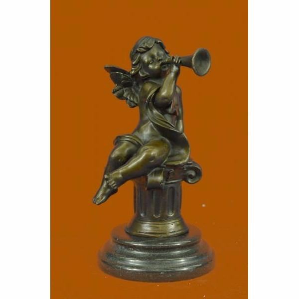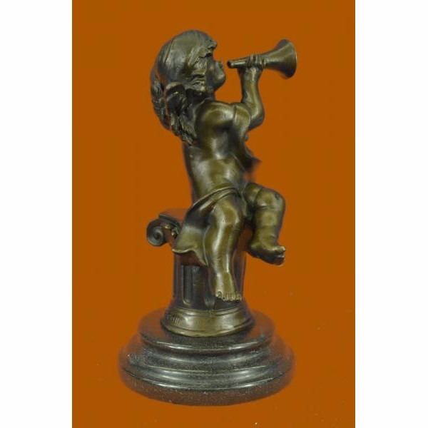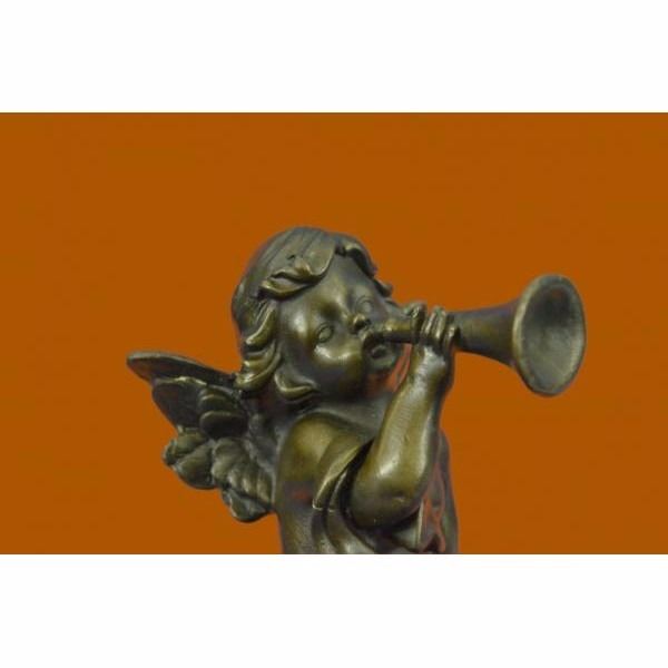 This beautiful bronze statue depicts an adorable little cherub playing theTrumpet . It is part of a series of cherub musicians and would look equally good inside your house or in your garden. He has a serene look on his face while he happily plays his Trumpet. The figurine sits on top of a marble stand. A lovely gift for anyone who has children or who works with children, or for anyone who loves all things celestial. This 100% Handmade Bronze Sculpture Was Captured Using The Archaic Method Of Lost-Wax Casting And Stained With A Brown Patina Finish and is signed A. Moreau. Condition : This sculpture is in perfect condition. Bronze Dimensions with Marble Base:Height 8" x Width 5" Marble Dimensions:Diameter 4" Height without base: 7" Weight : 5 LBS Inventory : 97YRD12753079