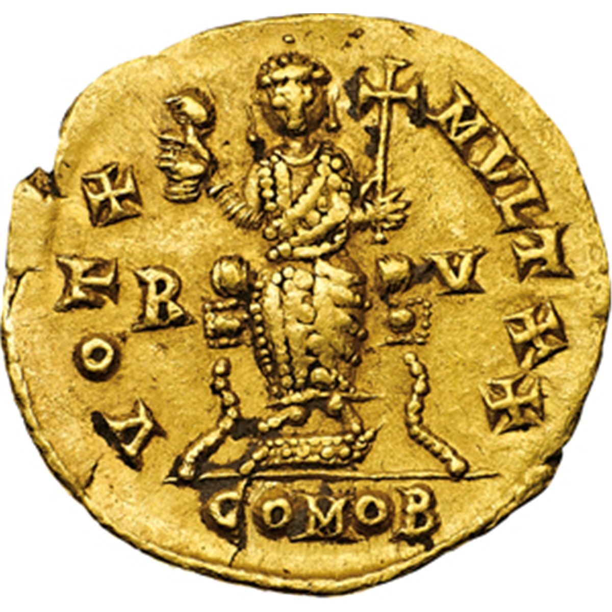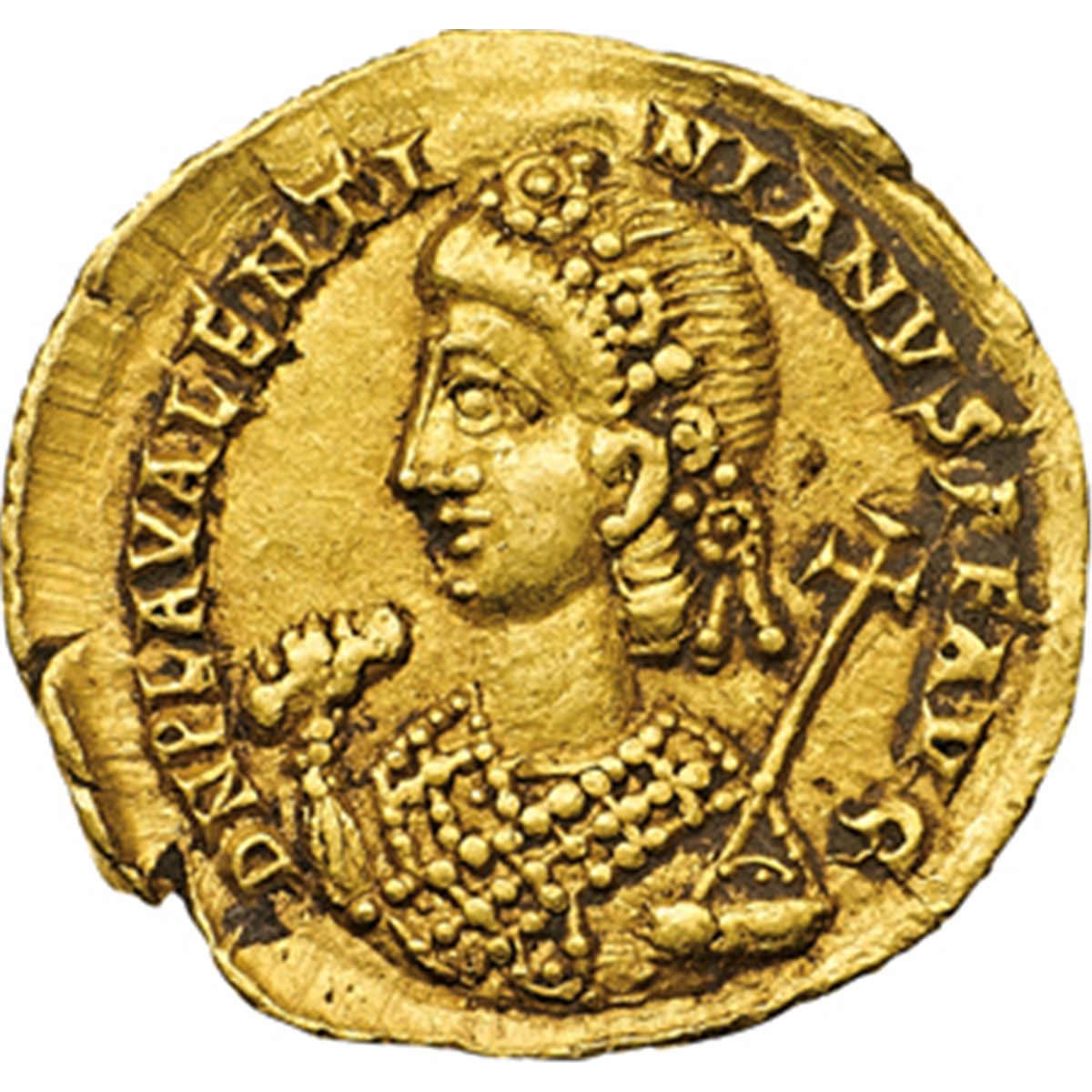 Impero Romano. Valentiniano III (425-455). Solido, Ravenna. D/ DN PLA VALENTINIANVS PF AVG. Busto diademato a sinistra che indossa manto imperiale e tiene mappa e croce. R/ VOT X MVLT XX. L'imperatore, seduto in trono di fronte, tiene mappa e croce. Nel campo, R-V. In esergo: COMOB. RIC 2036 (R3). Ranieri 99. AU. g. 4.44 mm. 20.00 RRR. Bel BB+. Di grande raritv†.
