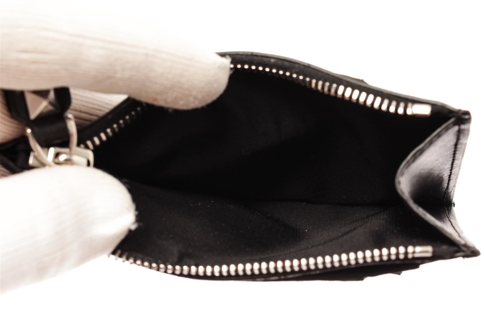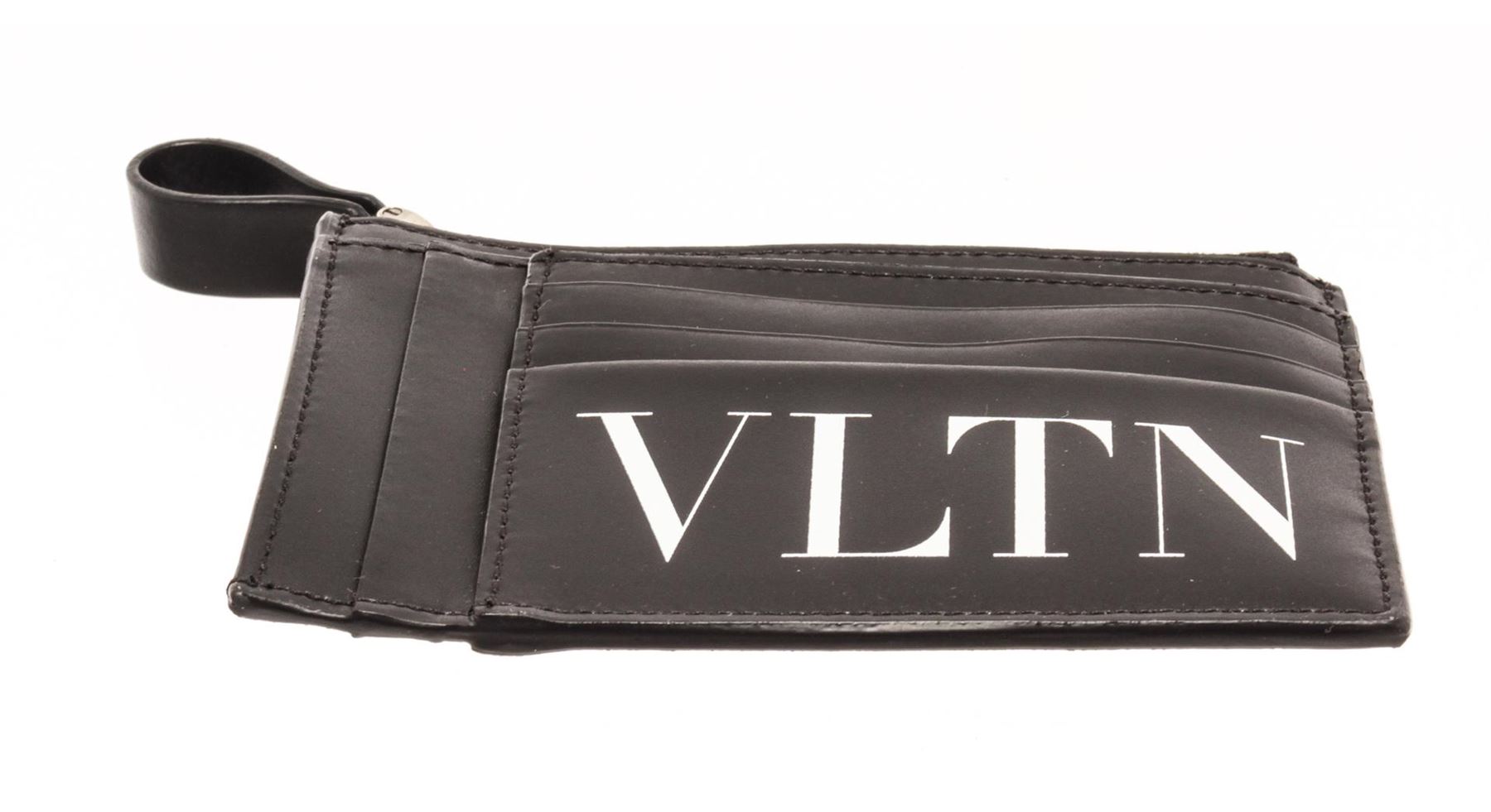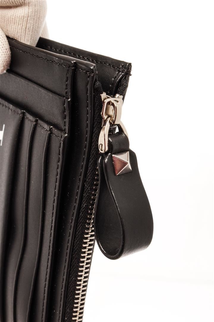 Valentino Black Leather Zip Card Wallet. All available information is listed in the description and shown in the photos. Valentino Black Leather Zip Card Wallet with silver-tone hardware, multiple cards slots, vltn print in contrasting color on the front, top zip closure.