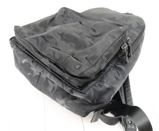 One Valentino Black Nylon Camustars Backpack. Item is sold AS-IS. All available information is listed in the description and shown in the photo. Valentino Camustars Backpack features black printed nylon with featuring zip fastening, gunmetal hardware, a front zipped pocket, leather adjustable shoulder straps and leather top handle. 13" x 16.1" x 8.3"
