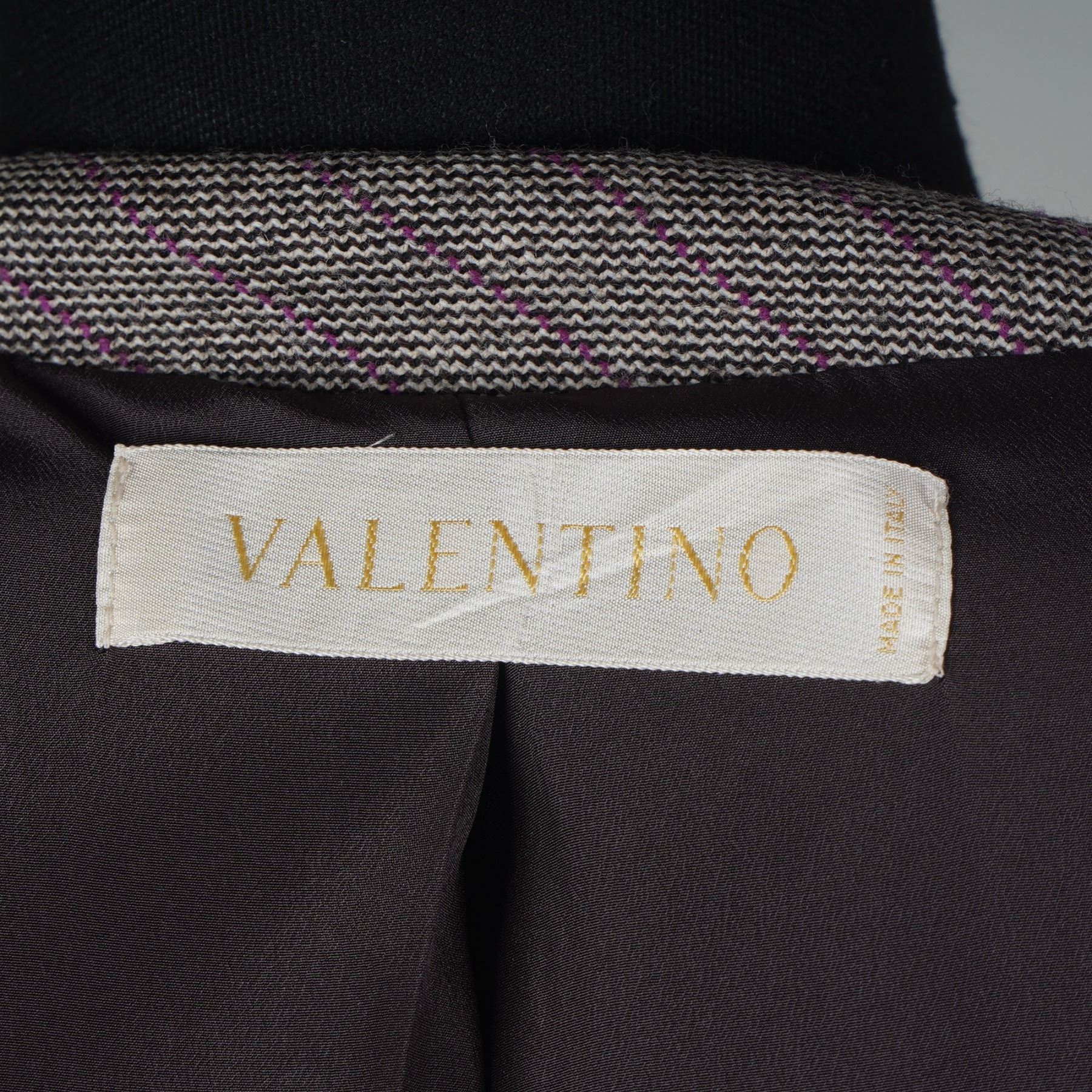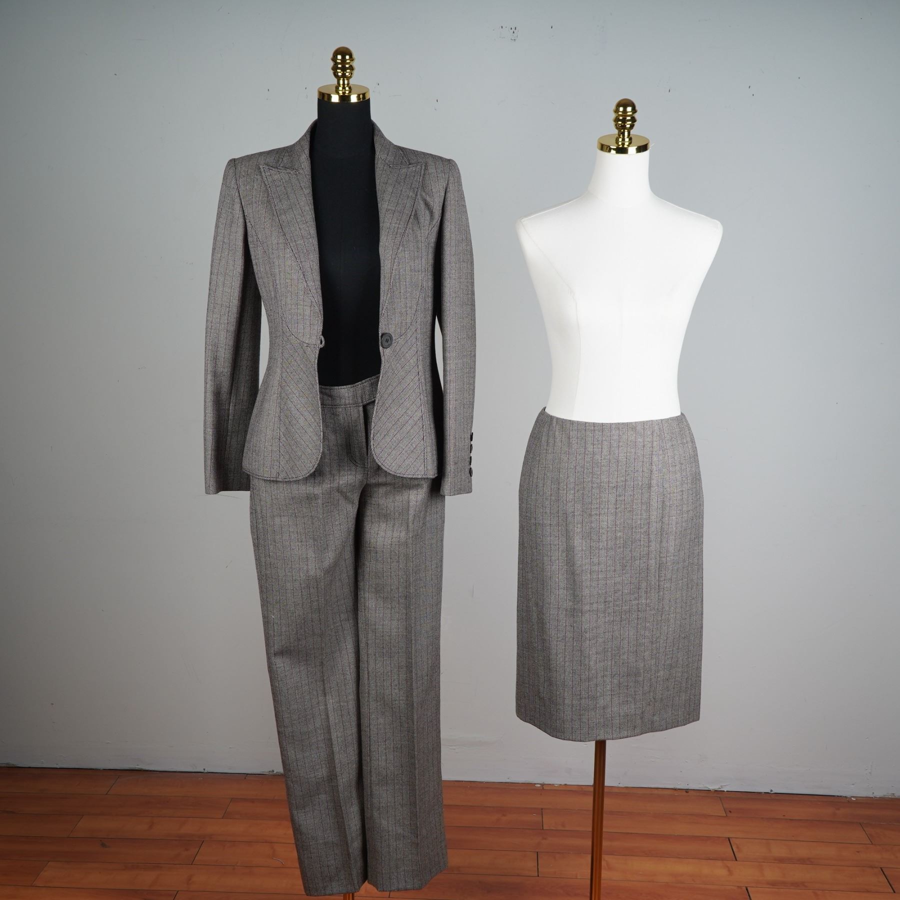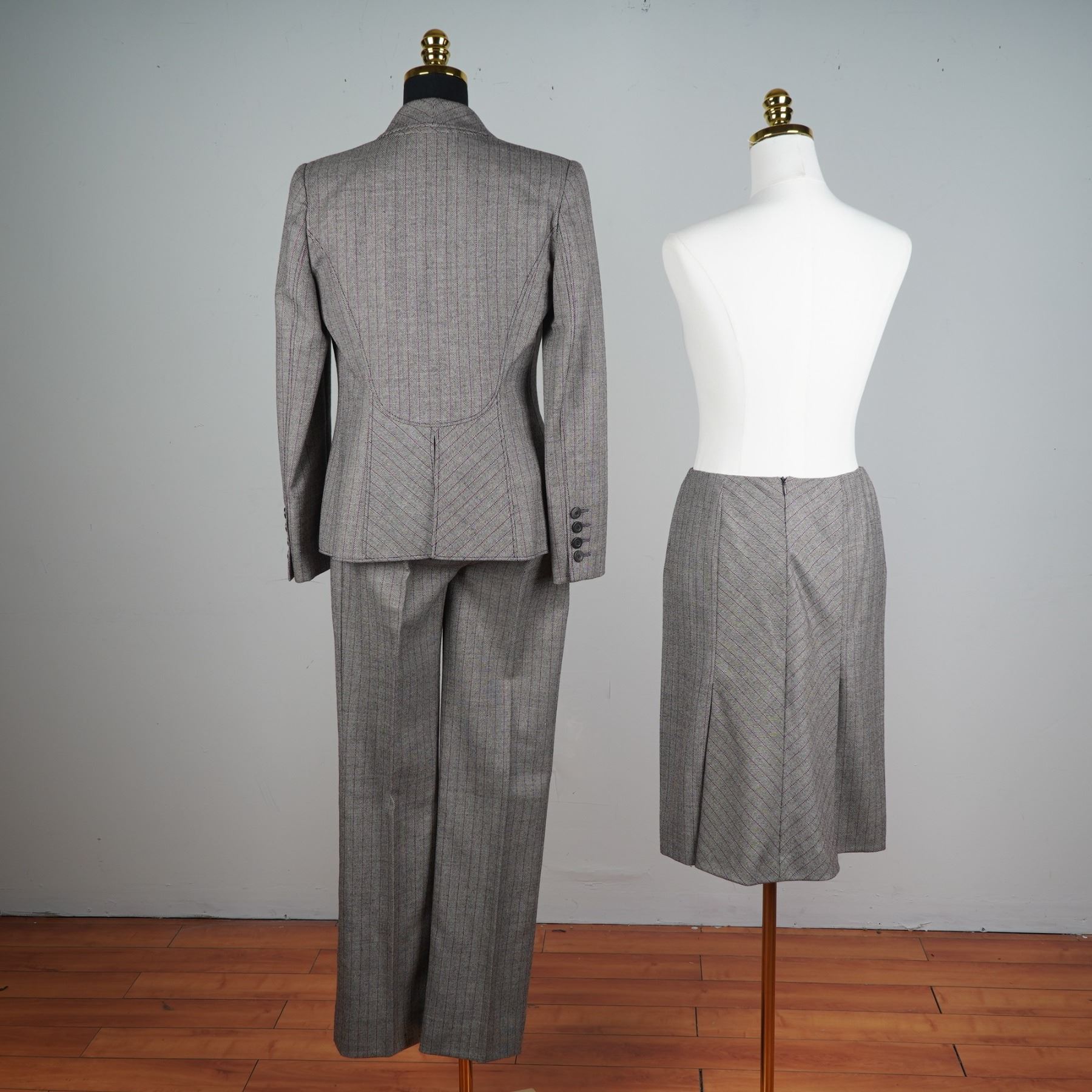 A refined and commanding three-piece wool suit set by Valentino, crafted in Italy with exceptional tailoring and luxurious fabric. This power ensemble includes a sharply structured blazer, wide-leg trousers, and a matching pencil skirt, all cut from a sleek gray pinstripe fabric accented with subtle purple threading. The jacket features a two-button closure and curved seaming that enhances the silhouette, complemented by button-cuffed sleeves and elegant back paneling. The trousers boast a classic mid-rise and crisp front pleats, while the coordinating skirt is designed with back darting and a rear vent for a polished yet comfortable fit. Each piece is fully lined and finished with precision, reflecting the masterful construction expected from the Valentino fashion house. Labeled Made in Italy and marked a Size 6, this versatile set transitions seamlessly from boardroom to formal occasion, offering multiple styling options. Dimensions: Jacket: 25"L; Pants: 39"L; Skirt: 23"L.