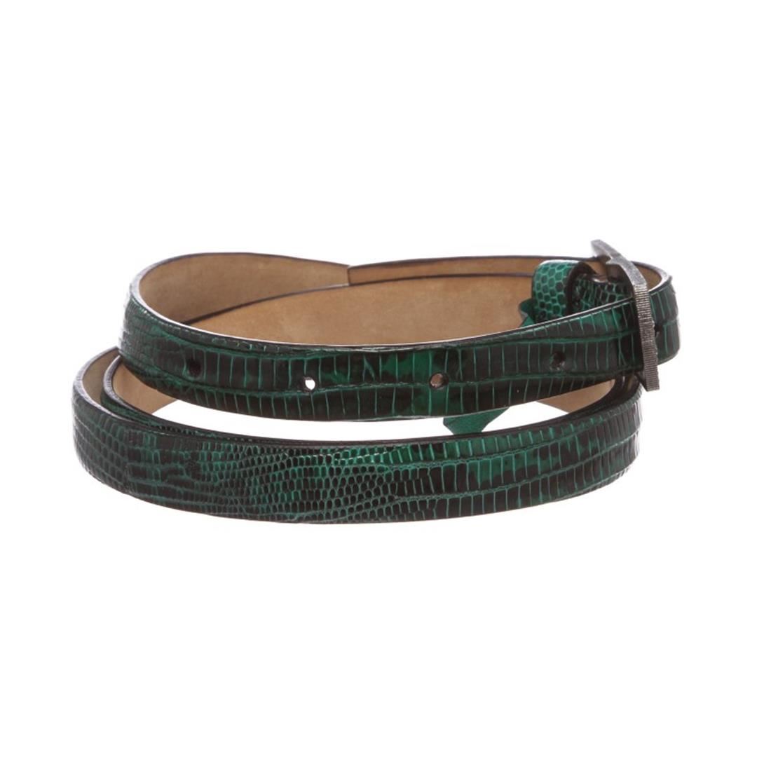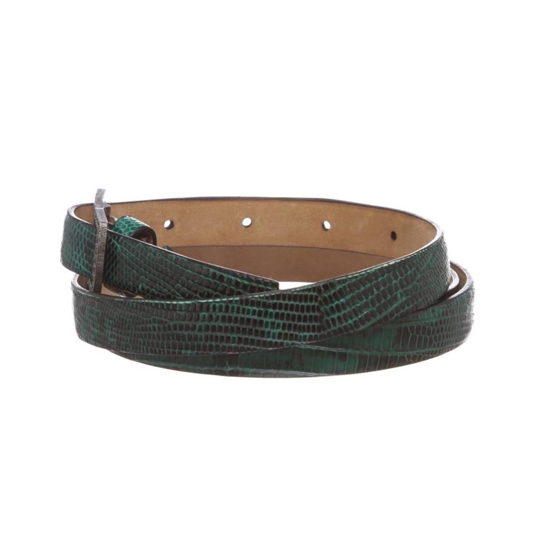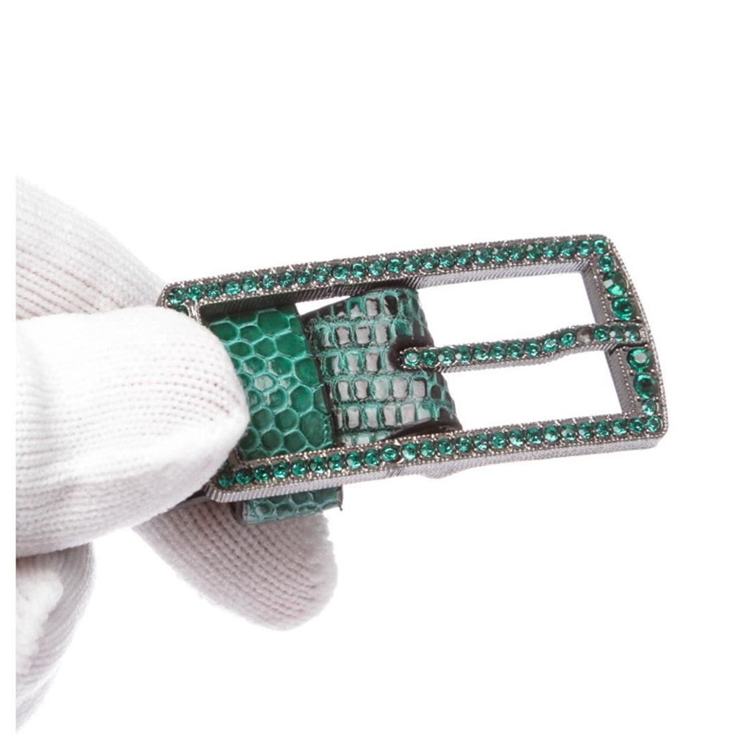 Green lizard Valentino belt with gunmetal-tone Rhinestone buckle closure at front. Item is pre-owned. Item Dimensions: Length:42.5" Width:.5"/Length: 107.95cm Width:12.7cm.