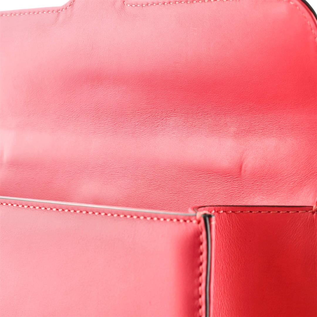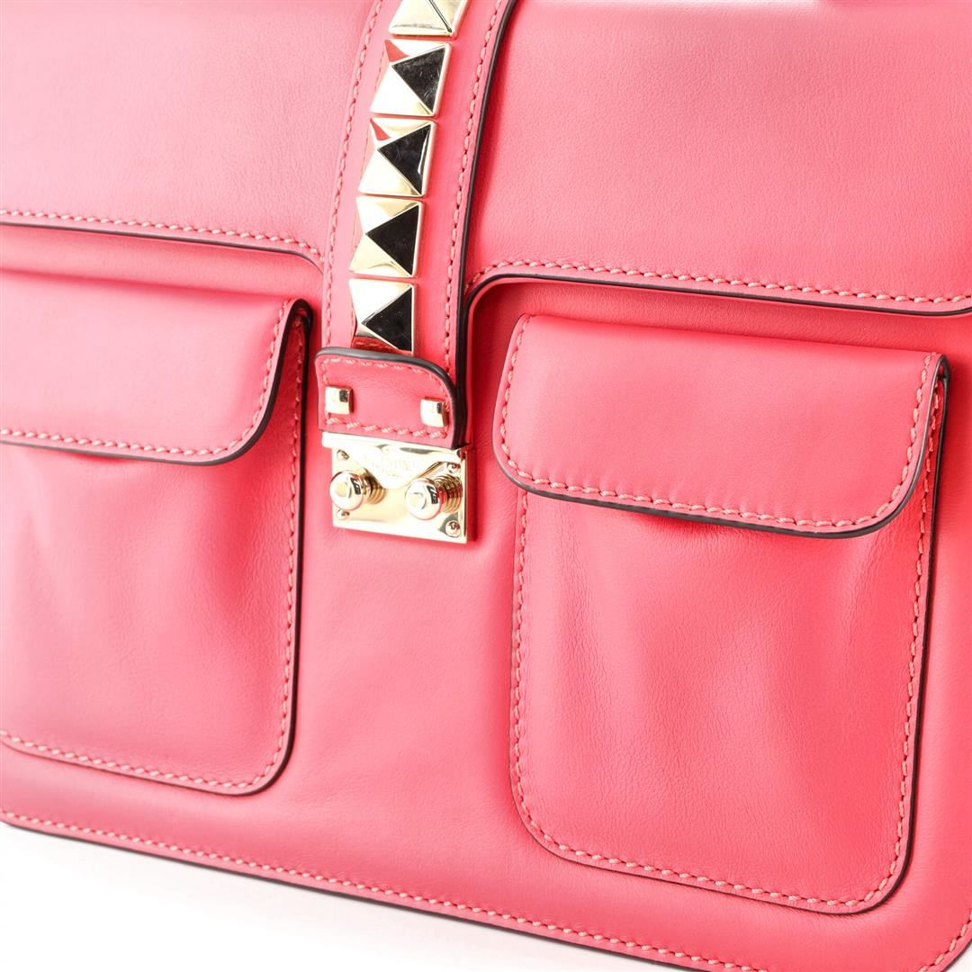 Valentino Pink Leather Glam Lock Top Handle Large Bag Condition Details: Light odor in interior. Creasing, minor scuffs and indentation on exterior, slight loss of shape on handle, cracking on handle base wax edges. Scuff and creasing underneath flap,