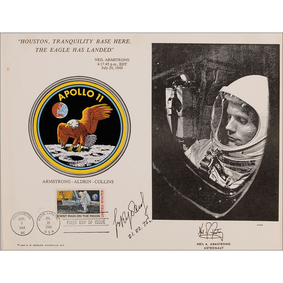 Unique 11 x 8.5 commemorative sheet bearing an image of Armstrong, a color decal, and a first day of issue stamp and postmark, produced by longtime autograph dealer Sy Kessler to commemorate the Apollo 11 landing, signed in black felt tip by Valeri Kubasov. In fine condition, with a uniform strip of toning along the left edge, and a few trivial spots of soiling.