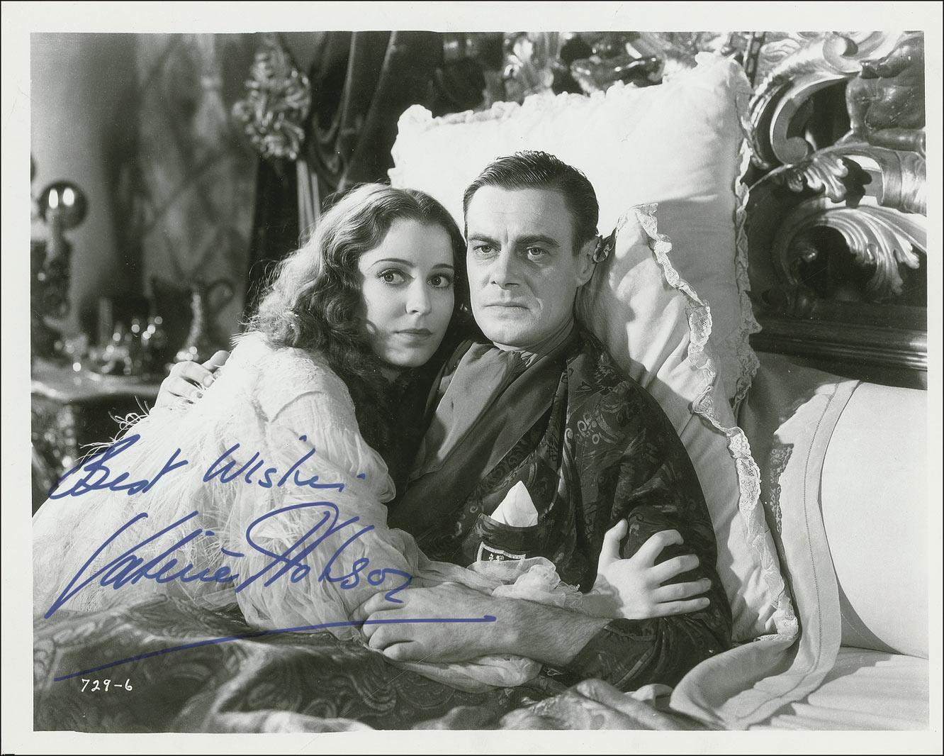 British actress (1917–1998) who appeared as Baroness Frankenstein in Bride of Frankenstein with Boris Karloff and Colin Clive. She also played opposite Henry Hull that same year in Werewolf of London. Glossy 10 x 8 photo of Hobson lying in bed with Clive in a scene from Bride of Frankenstein, signed in blue felt tip “Best Wishes, Valerie Hobson.” Scattered creases, light vertical bends passing through the image, and a couple of surface scratches, otherwise fine condition.