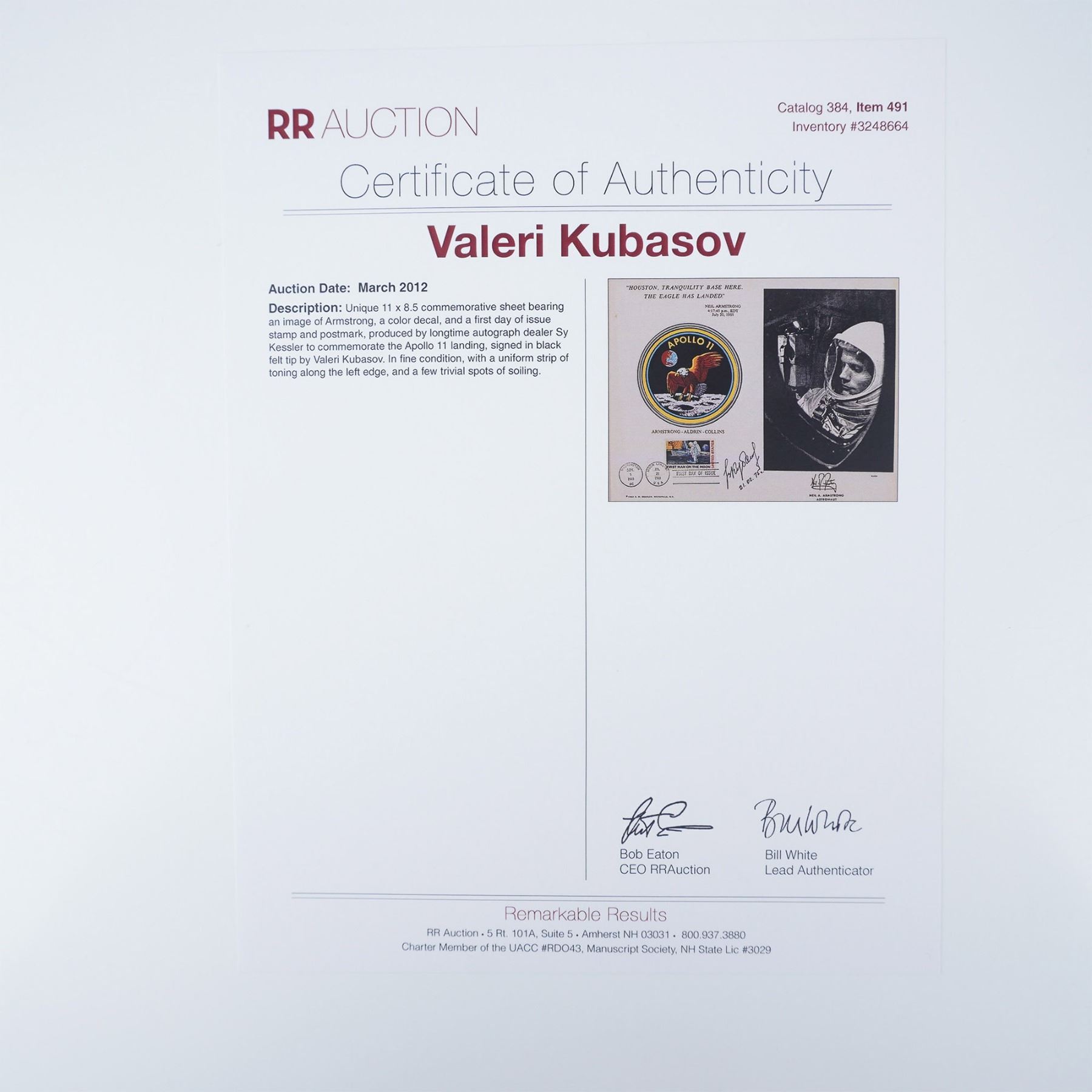 This rare NASA Apollo 11 commemorative sheet features an image of Neil Armstrong, the first human to set foot on the moon, alongside the iconic Apollo 11 mission decal. It also includes a First Day of Issue stamp and postmark commemorating the moon landing. The sheet is autographed by cosmonaut Valery Kubasov in black felt pen, dated February 21, 1975. Valery Kubasov (1935-2014) was a prominent Soviet cosmonaut and aerospace engineer who participated in three space missions: Soyuz 6 (1969), Soyuz 19 (1975, as part of the Apollo-Soyuz Test Project), and Soyuz 36 (1980). Kubasov was known for his significant contributions to the Apollo-Soyuz Test Project, which marked the first joint mission between the U.S. and the Soviet Union, symbolizing a rare moment of collaboration during the Cold War. A highly collectible item that connects two iconic eras of space exploration-Apollo 11 and the Apollo-Soyuz collaboration. This lot includes a RR Auction Certificate of Authenticity, verifying the signature's authenticity.