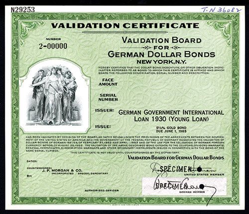 Germany - New York, 1953, 7% Gold Bond, Black on green border and underprint, Allegorical figures on left, Specimen overprints, POC's. S/N 1-00000. Rare specimen certificate. ABNC.
