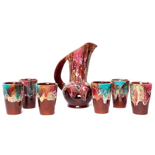 Vallauris lemonade set, France, pitcher and six glasses all covered in a multi-colored drip glaze, marked "Vallauris", pitcher 10.75"h, cups: 3.25"dia. x 4.5"h, mint condition