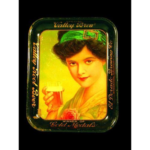 Valley Brew Root Beer Tin Serving Tray, El Dorado Brewing Co., Stockton, California, some scratches and paint chips otherwise fair to good condition, 10 1/2 x 13 1/4 inches.