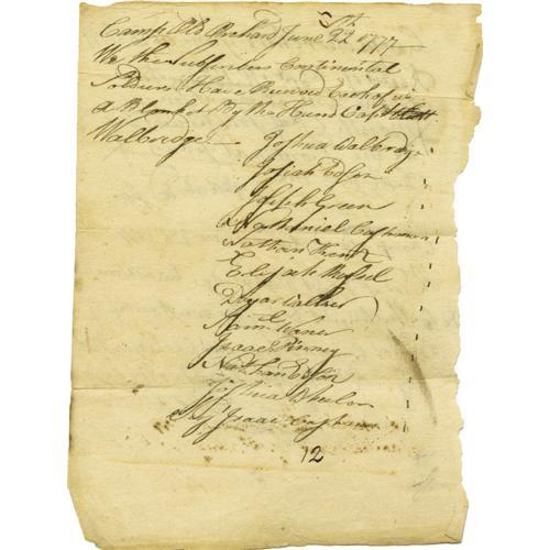 <B>Valley Forge - 1777 Document Archive.</B></I> Ten pages- blankets for Valley Forge. An amazing archive listing approximately 27 names of Connecticut soldiers who fought at Valley Forge and the provisions alloted to them. This archive contains seven items with regard to pay and provisions. The documents contain several names of Connecticut soldiers serving in the Continental Army at the time: <BR><B>"New Haven January 12th,</B></I> 1778 received of...1 blankett appraized at eighteen shillings for the use of Col. Meigs Reg't Capt. Jose. Mansfield & Company. Isaac Potter, Lt." <BR><B>"Camp Old Orchard June 26,</B></I> 1777 rec'd of Capt. Walbridge two pound limit - bean for one month...for...Josiah D. Fon..." <BR><B>"Camp Old Orchard June 28,</B></I> 1777 Rec'd of Capt. Walbridge two Mound shillings it being for one month pay for...done in the Continental Army Rec'd by me Samuel Jillard." <BR><B>"Camp Old Orchard June 22,</B></I> 1777 we the subscribers Continental Soldiers have received each of us a blanket by the Hand Capt' Walbridge." Signed names include, Joseph Green, Nathaniel Cushman, Nathan Kent, Sgt. Samuel Warner, Joshua Walbridge, Josiah Edson, Elijah Mussel, Isaac Pinney, Nathan Edson, Jephthah Whelor, and Corporal Isaac Cushman. All of these men were enlisted in the second Connecticut Regiment First Division. Nathaniel Kent is listed as having died on Feb. 4, 1778. Private Joseph Green is shown as being discharged on Jan. 9, 1778. <BR><B>A purchasing agreement</B></I> for 13 blankets dated at Preston, Nov. 27, 1777 signed by Ephriam Tucker, Elisha Tyler, and Samuel Tyler. The reverse of the invoice lists the names of Capt. Wm Belcher <BR><B>"Boston, December 22,</B></I> 1777 to the Committee of the pay table for the State of Connecticut. Gentlemen these are to inform you that six of the blankets which we sent you in the account dated ye 27th of last November are included in the Liut. Asa Story's Receipt who was Lieut in Capt. Wm Belcher's company in the Continental army. Also one blanket was delivered to Capt; Wm Belcher and sic to Ens'r Elisha Bordman which receipts we send you, Ephriam Tucker, Elisha Tyler and Samuel Tyler." William Belcher was the Captain of Connecticut's first Regiment. Elisha Bordman was part of Huntington's Brigade and was discharged in January 1778. <BR><B>"Mansfield 26th of May</B></I> 1777 Rec'd of the Select Men of the Town of Ashford Six blankets for the use of Robert Hale, James Hale, Amos Donset, William Southworth, James Eaton and Josiah Bickniel they being enlisted into my Company for the term of three years Rec'd John Shumways, Capt." Privates Robert and James Hale both enlisted in CT First regiment as were Dowset, Southworth, Bickniel, and Eaton. The document is also signed by Caleb Hender, a Private from the Third New Jersey Regiment, and a Massachusetts Private, Simeon Smith. The 2nd Connecticut was raised from Connecticut recruits in 1777 for the Army of the "Continental Line." The 2nd Connecticut was at Valley Forge, for the harsh winter of 1777-1778 and at the Battle of Monmouth, NJ in June 1778 to what would become "the most scorching summer day ever known in America." The 2nd Connecticut Regiment fought at the battle of Whitemarsh in December of 1777.<BR><BR><b>Shipping:</b> Books & Catalogs (<a target="_blank" href="http://www.heritageauctions.com/common/shipping.php">view shipping information</a>)