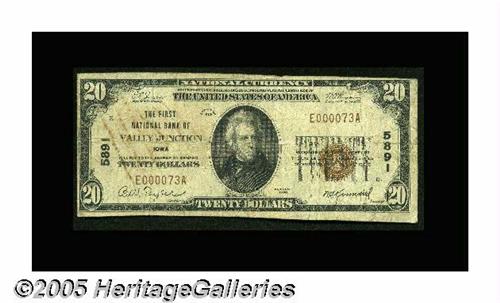 <B>Valley Junction, IA</B></I> - $20 1929 Ty. 1 <B>The First NB</B></I> Ch. # 5891<BR>A number of linear deposit indications are the only distractions on this <B>Fine</B></I> note from the only issuer in this Polk County community. Only 160 sheets of the Type 1 $20 denomination were printed.