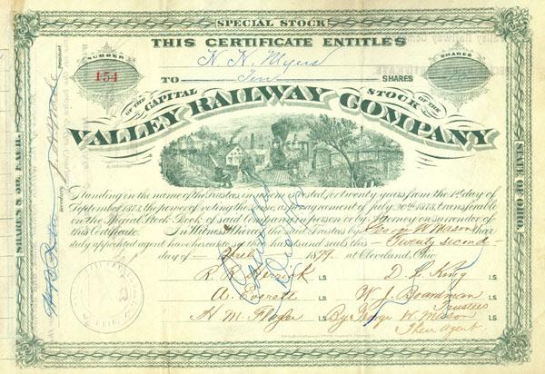 1879, Ohio. Stock certificate for 10 shares. Green. Vignette of railroad scene at center. Pen cancelled. Very fine.