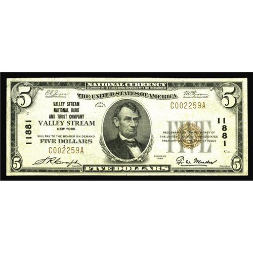 <B>Valley Stream, NY</B></I> - $5 1929 Ty. 1 <B>Valley Stream NB & TC</B></I> Ch. # 11881<BR>Fives only from this scarce and desirable Nassau County bank, the only issuer in this formerly sleepy south shore community that became a shopping mecca with the opening of the Sunrise Highway and Southern State Parkways. This is a very tough bank to find in either large or small size, with the Gengerke data showing no offerings at all from here since 2001. <B>Very Fine.</B></I>