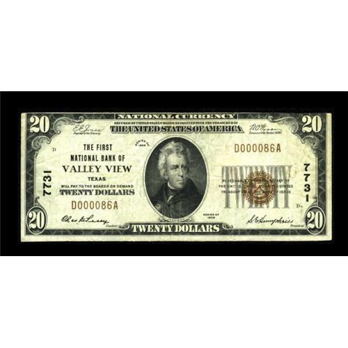 <B>Valley View, TX</B></I> - $20 1929 Ty. 1 <B>The First NB</B></I> Ch. # 7731<BR> A new addition to the census of seven small size notes known from here with auction appearances few and far between. Peery and Humphries sign as the officers. <B>Fine+.</B></I><BR><BR><b>Shipping:</b> Coins & Currency (<a target="_blank" href="http://www.heritageauctions.com/common/shipping.php">view shipping information</a>)