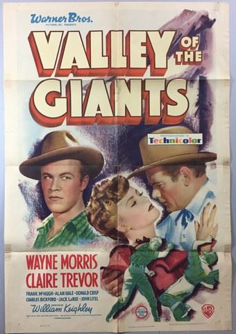 Valley of the Giants (Warner Bros, 1938) poster. Adventure. Starring Wayne Morris, Claire Trevor, Frank McHugh, Alan Hale, Donald Crisp, Charles Bickford, Jack La Rue, John Litel, Dick Purcell, El Brendel, Russell Simpson, Cy Kendall, Harry Cording, Wade Boteler, Helen MacKellar, Addison Richards, Jerry Colonna. Directed by William Keighley. Light edge wear, creases, tears, paper loss, tape. Fair. (27"x41").