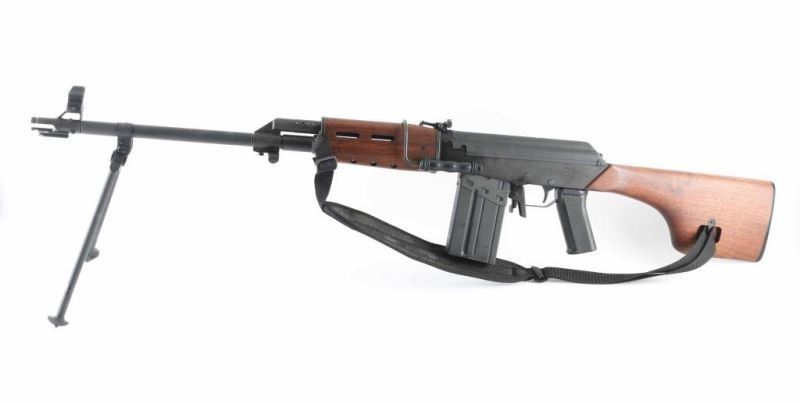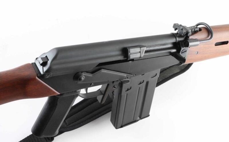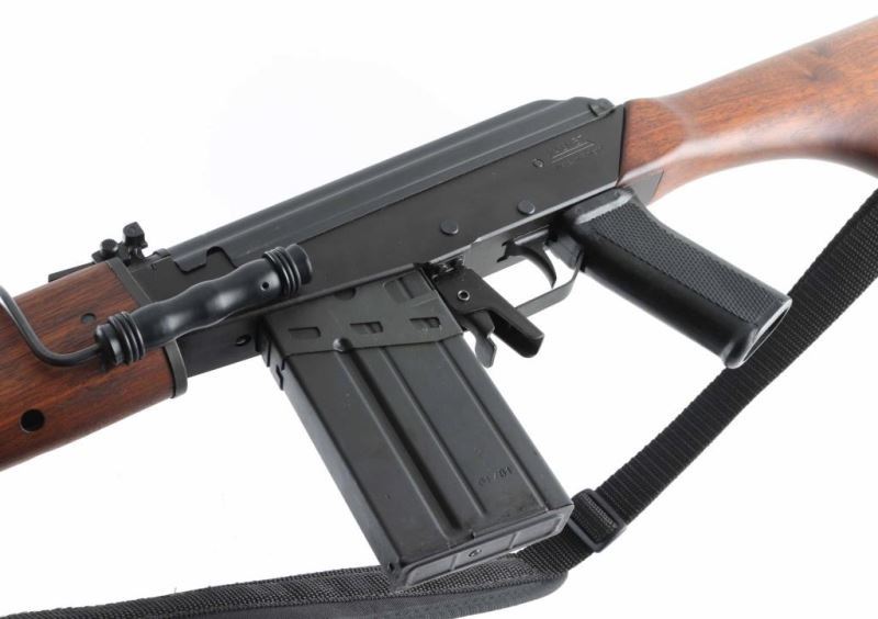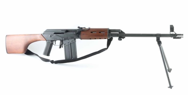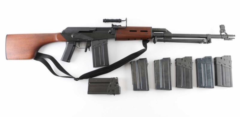 Finnish semiautomatic rifle marked "Elmsford NY" on receiver inside trigger guard. Based on AK-47/AKM/RPK type rifles, scaled up for the larger and more powerful 308 Win cartridge. Features matte gray parkerized finish, ventilated wood handguard, wood club shaped stock, black polymer grip cap, 22" heavy barrel, protected blade front sight, tangent rear sight, three pronged flash hider, bayonet lug, folding bipod clamped to barrel, manual safety, folding carry handle, rubber buffer behind ejection port to deflect brass. Bore is very good condition. Retains 90% finish on metal parts, with rub spots on barrel & bipod, drag line where safety rides on receiver. Wood is excellent condition. Includes (7) 20 rd magazines, (1) 5 rd magazine, (2) spare firing pin, padded nylon sling. Condition is NRA Excellent *** Modern Firearm ***