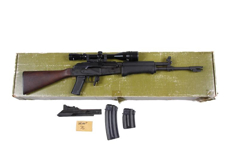Valmet Mdl M76 Cal .223 SN:160781 Semi-auto sporting /hunting rifle patterned after the AK47 made in Finland. Flat black finish, wood straight grip stock with polymer checkered pistol grip and forearm, 16" barrel with flash hider and Tasco 4-16x40 scope,Semi-auto sporting /hunting rifle patterned after the AK47 made in Finland. Flat black finish, wood straight grip stock with polymer checkered pistol grip and forearm, 16" barrel with flash hider and Tasco 4-16x40 scope, good bore and action.Condition: Perfect with no sign of use. In original box with 2 magazines, cover with iron sights.