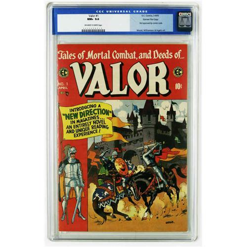 <B>Valor #1 Gaines File pedigree 8/12 (EC, 1955) CGC NM+ 9.6 Off-white to white pages.</B></I> This "New Direction" title from EC was tailor-made to showcase the incredible talents of artist Wally Wood. Wood provides the great "battling knights" cover, complete with a huge castle in the background, and a King Arthur tale inside. Other artists include Al Williamson, Bernie Krigstein, and Graham Ingels. This first issue was not approved by the Comics Code Authority, a situation that changed with issue #2. Overstreet 2005 NM- 9.2 value = $380. CGC census 12/05: 2 in 9.6, 1 higher.