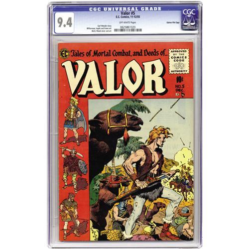 <B>Valor #5 Gaines File pedigree 9/12 (EC, 1955) CGC NM 9.4 Off-white pages.</B></I> This last issue of <B>Valor</B></I> signals the beginning of the end for EC's line of New Direction comics. They certainly went out with a bang with this great issue, loaded with exciting art by Wally Wood, Al Williamson, Graham Ingels, and George Evans. Overstreet 2006 NM- 9.2 value = $220. CGC census 03/06: 1 in 9.4, 1 higher.